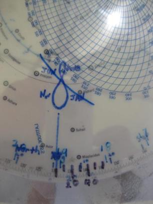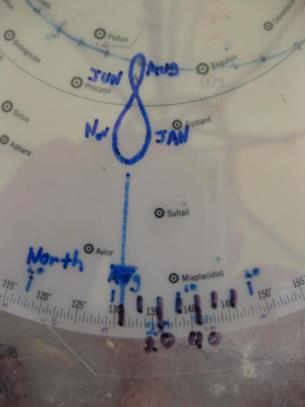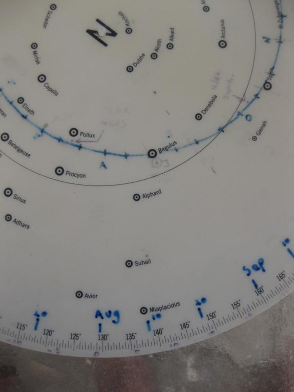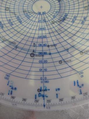 As I have posted before, I have added several scales to my 2102-D to make it easy to set. The first photo shows the base with a date scale added and the second photo shows the time index set to August 2 (one degree past the "Aug." mark.) The third photo shows the 35 degree latitude blue disk turned so that the Zero altitude line touches the intersection of the ecliptic and the analemma which then shows the time of sunset as 1907 standard time (plus one hour for daylight savings time.) The fourth photo shows the nautical twilight (minus 12 degree) curve aligned with the ecliptic and the analemma which then shows the time of nautical twilight, 2010 (plus one hour for daylight savings time), and automatically set the blue disk to show the positions of all of the available stars and also allows you to read out the LHA of Aries, photo 5.