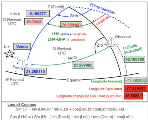 And here is a screen shot of my test case and solving the Navigation Triangle to determine Longitude