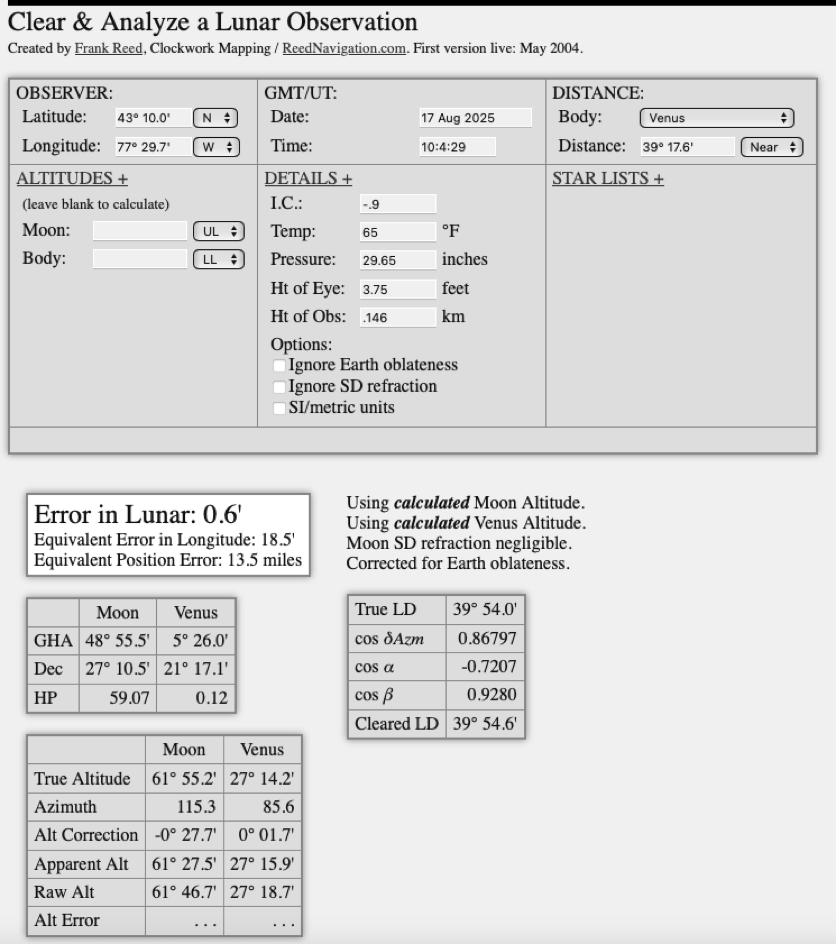 Thank you for teaching Lunars. I enjoyed the class. I particularly enjoy doing Lunar sights in my backyard. My next step is to spring for a metal sextant.