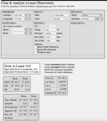 Thanks for explaining the methodology used for Error in Longitude derived from Error in Lunar. Standard Rate 12 sec per .1 arc minute was what I was missing!