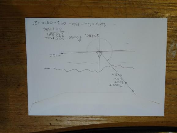 Nice one Gary, but what if it’s cloudy? The only two marine swings I’ve witnessed have been using the adjuster’s favorite transit. They never seem to go far offshore. If you don’t have an azimuth ring, you can use an astro-compass in the relative bearing mode. Just move slow-ahead on as near the desired course you can manage and take the relative bearing of the transit line as you pass through it. See the diagram.