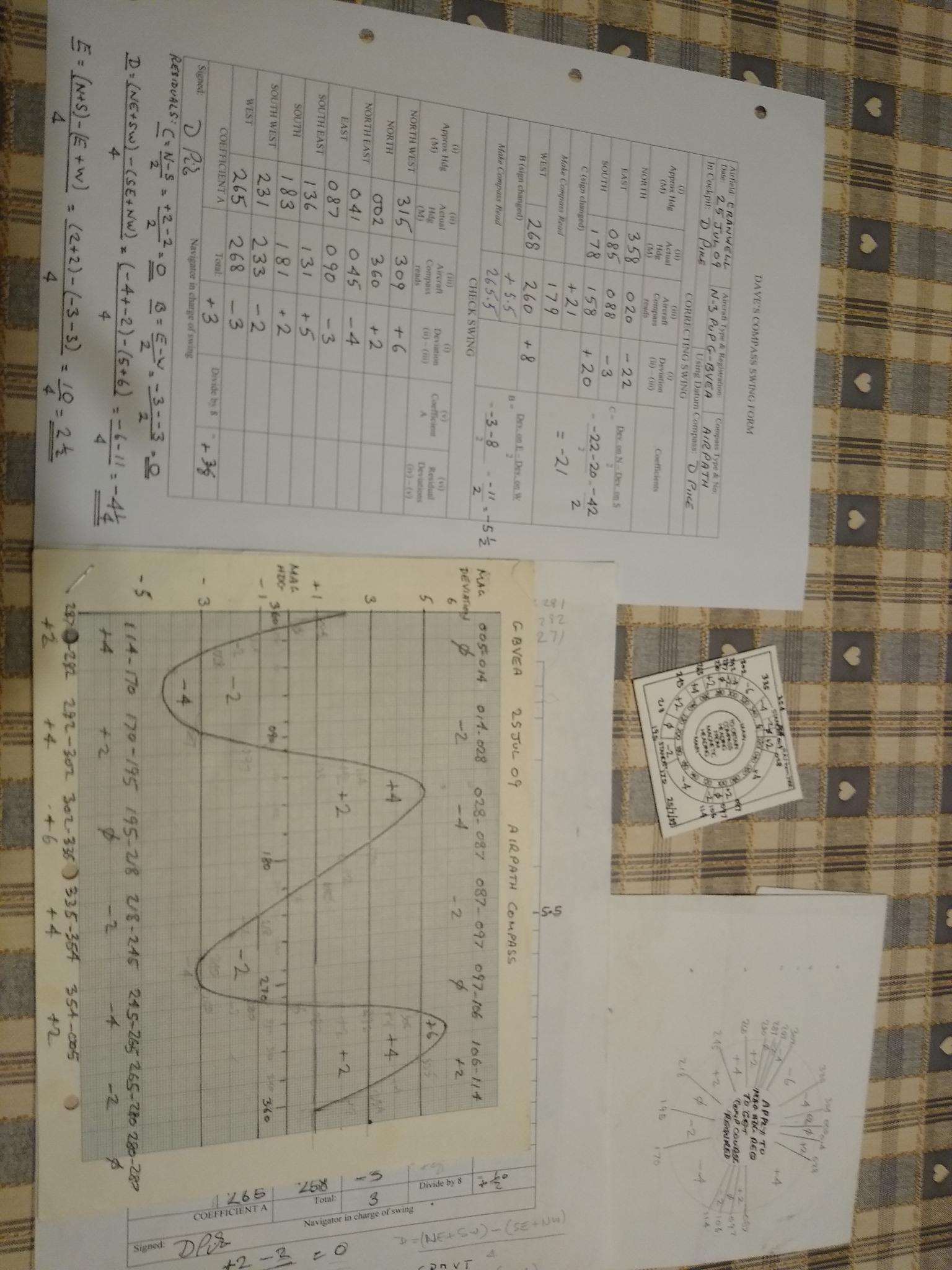 I found a more complete swing from 2009. I’d only just had her, and I doubt if she’d been swung before. Therefore, the compass was way out initially. It got better, eventually. By rights, I should have had the engine running and the tail jacked up, but I was alone on a lonely airfield, and if she’d have jumped her chocks, I’d have been in trouble. DaveP