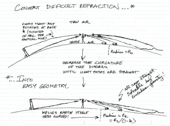 The variable density of air low in the atmosphere (quantified by the lapse rate) bends light rays downward normally. The amount of bending can be measured in minutes of arc per nautical mile. Typically this rotation, this downward bending is much less than a minute of arc, roughly 0.1' per nautical mile. Since this rotation is proportional to distance, mathematically we can represent it by changing the curvature of the Earth! Un-curve the Earth by 10% and make the light rays straight. The big advantage of this trick is that it applies to every problem that we can imagine: dip, angular height of objects beyond the horizon, dip short, distance to the horizon, etc. You do the geometry to solve these problems as if light rays travel in straight lines using the normal radius of the Earth, and then you replace the radius with a slightly adjusted value at the end. This is the origin of the various formulae in 1970s/80s editions of Bowditch that include a "beta" parameter. The big catch is that this parameter is not a constant; it's weather-dependent.