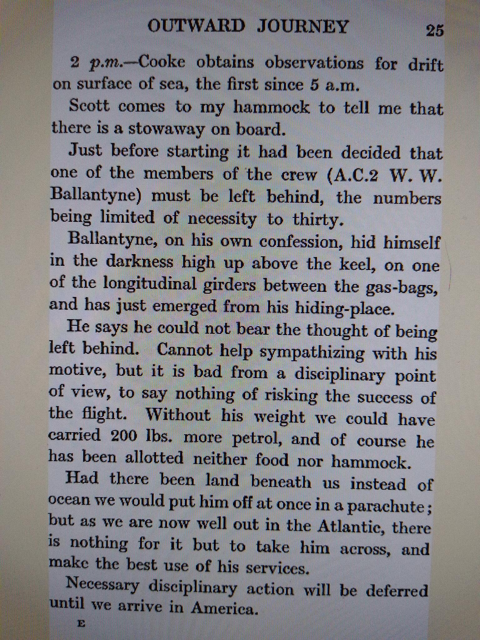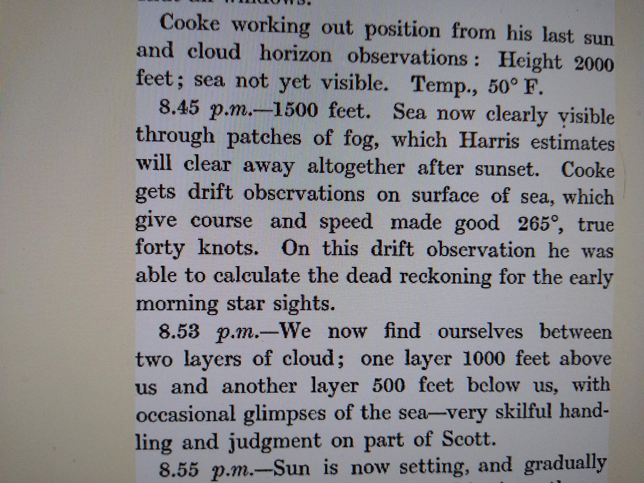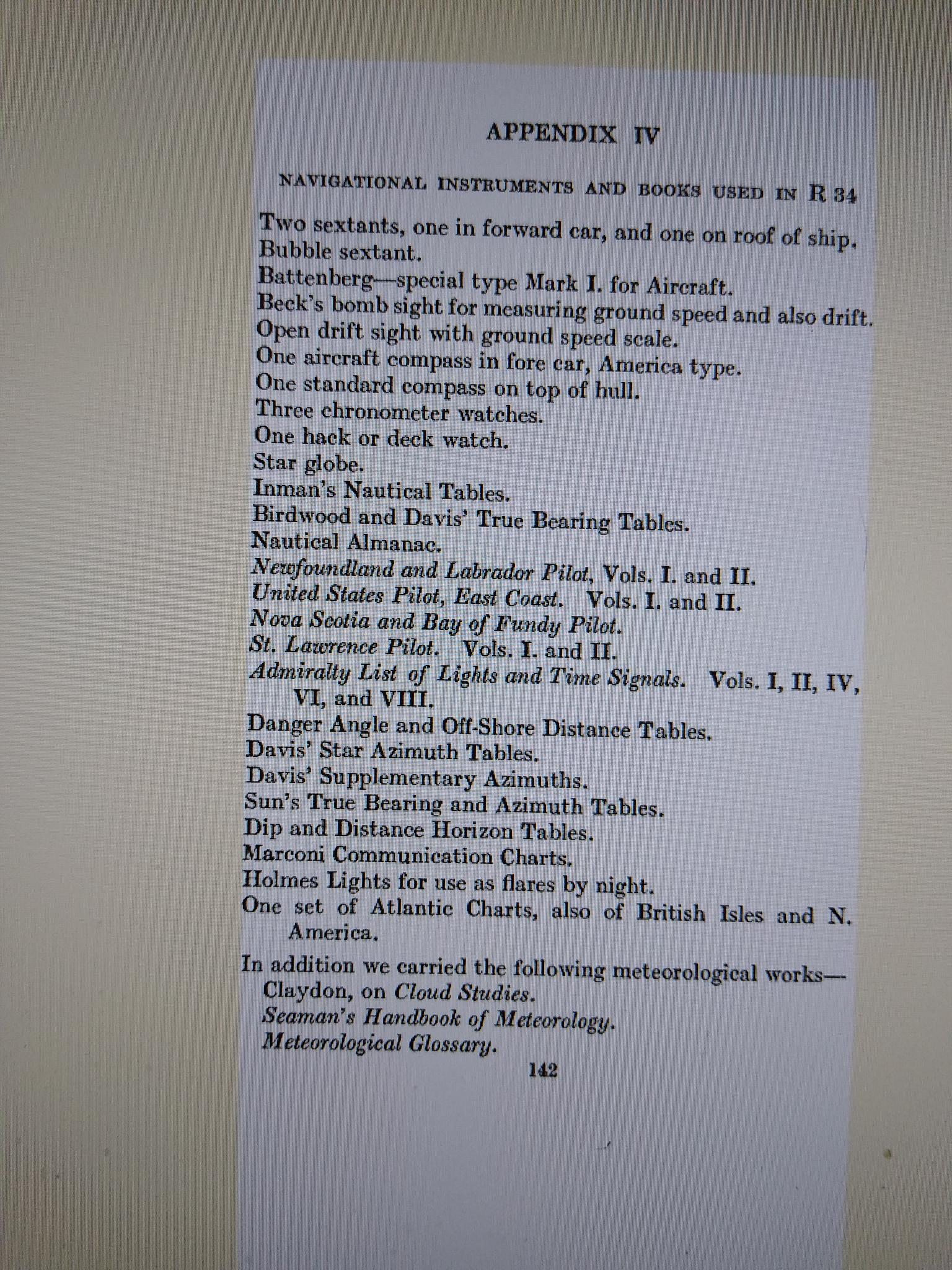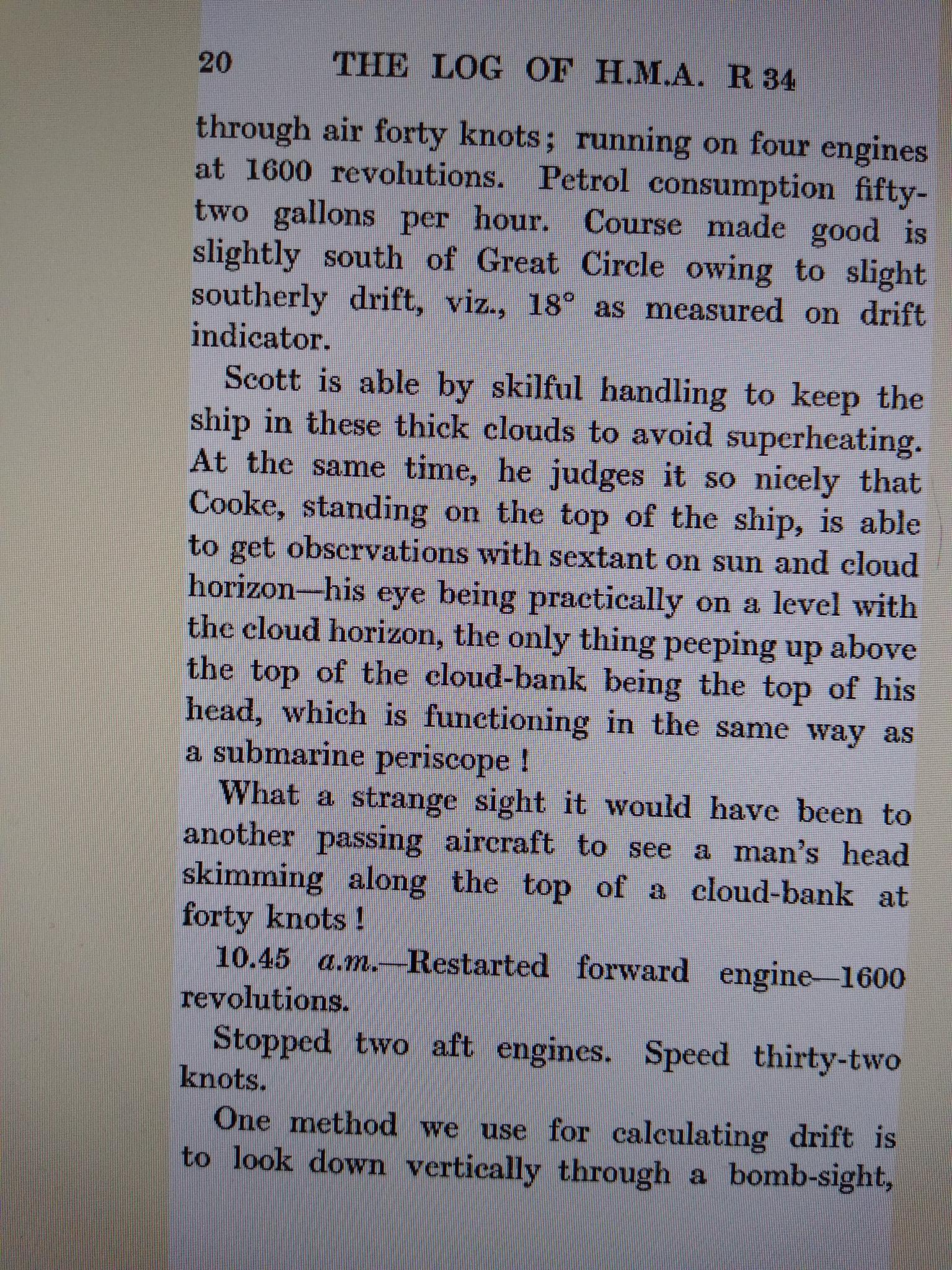 They did take both types of sextants. They did shoot celestial. They did use cloud horizons. They did shoot noon sights, and they also climbed out through the top of the airship occasionally to do so. They also found a stowaway, a kitten, had carrier pigeons, and a comic who used the chief officer’s toothbrush to stir the mustard at lunchtime. The crew sound like a fine bunch of chaps. You can read all this in Air Commodore E. M. Maitland’s* fine little book ‘The Log of H.M.A. R34 Journey to America and Back’ available from Kindle for £7.91GBP.