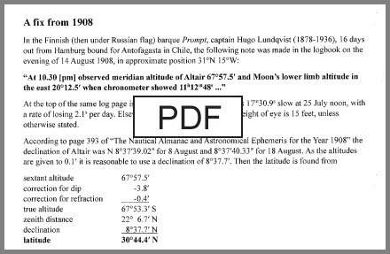 Reading old ship's logbooks, you find that most often the sun is used for determining position. But sometimes you will find exceptions. Enclosed is such an example from 1908, where Altair is used for latitude and the moon for longitude. In enclosed document I have tried to recreate the calculations involved. Read the first three paragraphs and then try yourselves.