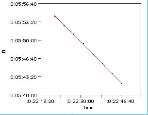 I thought I'd post a graph of Gregory's lunar listed by George Huxtable, despite the injunction against attachments. The line is a fit of a straight line to the data, which had an R-square of 0.9990. To fit the data on my spread sheet, which knows about hours, minutes and seconds, but not degrees, minutes and seconds, I subtracted 24 degrees from the distance. Also, since George had bragged about the data being so good, I assume that his data point at 22h 39m 00s 29d 43' 50" was a typo, where the 43' should have been 45', and changed that point accordingly. To all us nascent lunarians, when our data on land look like these, we should be as ready as we can be for sea! Fred