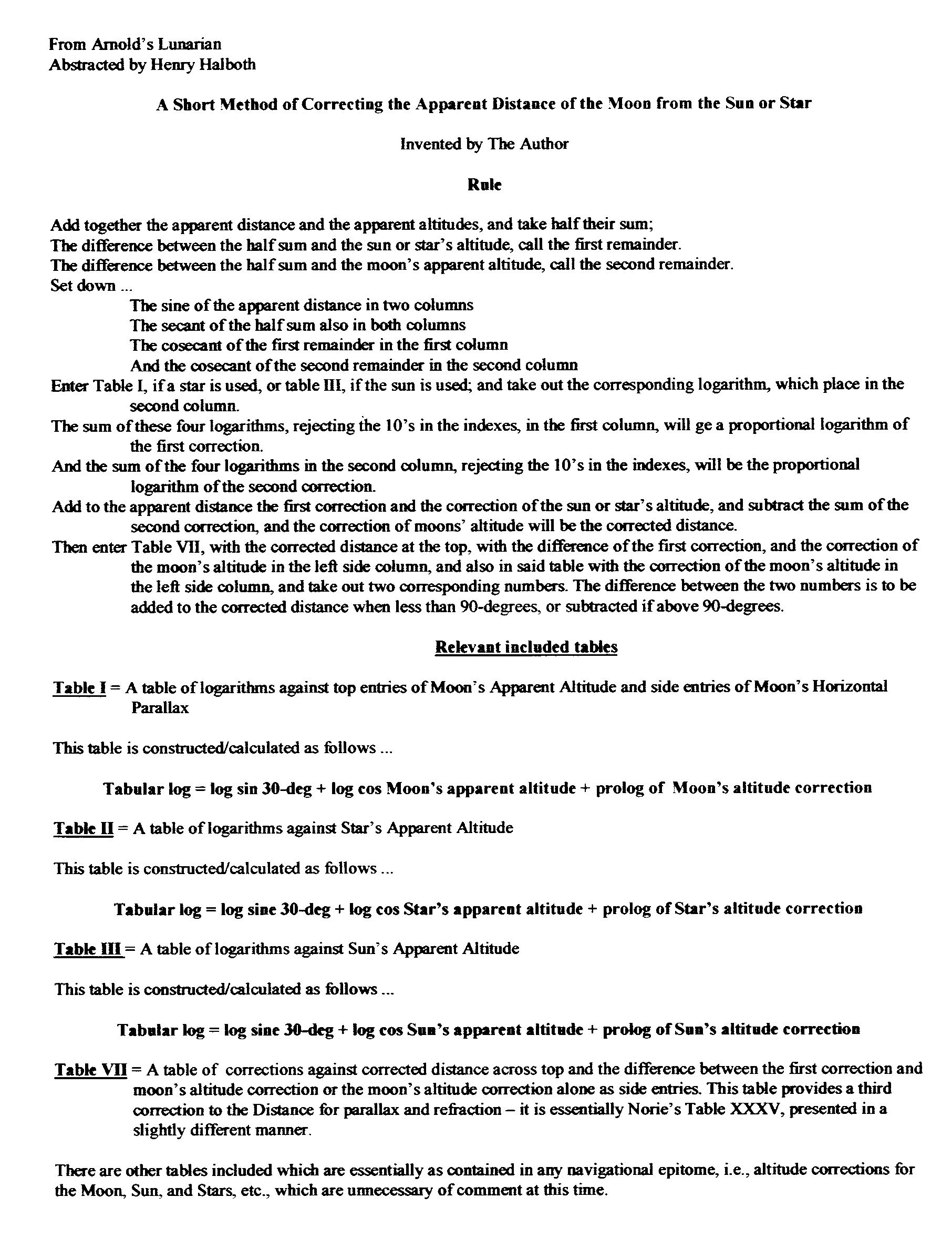 I have completed a preliminary review of the short Lunar Distance clearing method proposed by Thomas Arnold, which I shall henceforth entitle Arnold's Method, as contained in his "The American Practical Lunarian and Seaman's Guide", published at Philadelphia, PA, in 1822. An abstract is attached, providing the rules for working this method, as well as a description of the tables utilized by the author to facilitate the working thereof. Taken as a whole, Arnold's book is more descriptive of the Lunar Distance method than are either Bowditch or Norie, although the theory on which the actual solution is based remains rather secretive - it is unfortunate that this book seems rather rare and that the author has received little or no recognition for his apparently unique and perhaps purely American contribution to the art. According to himself, Arnold was an American Shipmaster of some 40-years experience at sea, including 28-years as Master. It is during this time that he claims to have developed the method presented, and claims also to have utilized it for 5-years at sea in manuscript prior to publication. He, by the way, states an expected accuracy in the use of Lunars of from 10 to 15 miles. At one point in time he operated a school of navigation at Philadelphia for the purpose of teaching the Lunar method. I have prepared a work format for Arnold's method and will shortly try it for accuracy and convenience against other methods, of which there are perhaps over a hundred, although few have actually been published.
