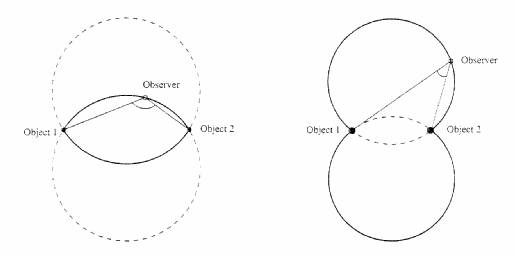 Indeed the LOP associated to an horizontal angle, are two circles. See the pic for AH >90º and AH < 90º