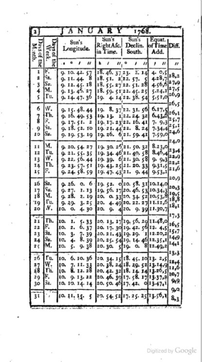 Google books shows Nautical Almanac and Astronomical Ephemeris for, 1767, 1768, 1772, 73,74,75,76,77,78,79,1781,1783,1792 (stopped looking for years after Cook's death). Jan page for 1768 attached.