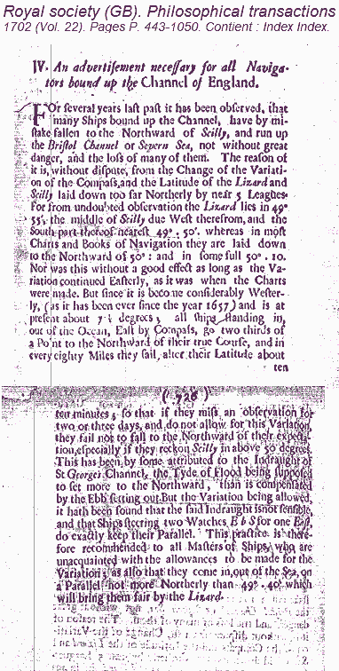 Ted sent me a copy of his book, in trade for a copy of my historical atlas software. I've been reading through it for a few days now. It's fascinating. I find something intriguing on almost every page. I would not say that I agree with ALL of his conclusions, but that does not detract from the book's value in any way. The prose is breezy and clear, and there are plenty of useful diagrams, including one that is intriguingly labeled "A drawing of the author's working model of Newton's brass marine octant." Got a photo for us, Ted?? :-) The only real flaw I have found so far is that the references are a little sparse. For one example, he mentions that one Mary Mumford, resident of the Scillies, confessed on her deathbed to possessing Sir Cloudesley Shovell's large emerald ring. How do we know it was "Mary Mumford" and what was the source for that? I also noticed a certain parallel to Sobel's story when approaching the "bad guy" problem. Dava Sobel, in her book, wrote, "A story that hails a hero must also hiss at a villain --in this case, the Reverend Nevil Maskelyne." While Ted Gerrard, in his book, writes, "If this story must have a villain to balance the heroic qualities of Halley, Cloudesley Shovell is the man who best fits the part." Just so we're clear here, I'm not suggesting any sort of direct influence, just a parallel approach to history, an approach that may get one into trouble. Heroes and villains? All of us mortals are flawed, imperfect beings. As a teaser, I'll quote a paragraph from the back cover of the book: "Sir Isaac Newton never mentioned his only invention again and Captain Edmond Halley, RN, never published any details of how he determined either latitude or longitude on any of his voyages of discovery aboard Paramore. He did however publish a warning to mariners over the incorrect location of the Scilly Isles - a warning his commander-in-chief Admiral Sir Cloudesley Shovell foolishly ignored." For general inerest, I'm attaching a copy of the actual pages which include the warning about the latitude of the Scillies as published in the Transactions of the Royal Society in 1701/02. Ted's theory, that Shovell "foolishly ignored" this refined latitude, makes sense only if Shovell did NOT believe his vessels were in a different longitude. That is, if he had NO firm idea of his vessels' longitude, or if he believed his longitude might be rather close to the longitude of the Scillies, then of course he would have avoided ANY reported latitude for the Scillies. But if he believed his longitude placed him a day's sail or more to the west of the Scillies, then it's a different matter altogether. A commander orders his ships to sail into stormy darkness only if he believes he's nowhere near land --unless he's an idiot, which, I admit, is always a possibility. -FER http://www.HistoricalAtlas.com/lunars --~--~---------~--~----~------------~-------~--~----~ To post to this group, send email to NavList@navlist.net To , send email to NavList-@navlist.net -~----------~----~----~----~------~----~------~--~---