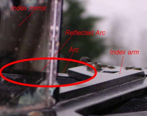 Isonomia wrote: > Whilst it is easy to calibrate a sextant's zero reading, is there any > way to calibrate any other readings? > You should start with aligning the telescope with the frame: Look through the horizon mirror through the telescope to the horizon (so by reversing the sextant) while you hold the sextant horizontal. Now the horizon should show as a continuous line running exactly through the middle of the telescope and exactly aligned with the upper edge of the mirror (the silvered part that is). Check if the index mirror is perpendicular to the frame. For this you have to look from 'above' the instrument to the divided arc and try to see the arc and its reflected image at the same time. When properly aligned both arcs should be aligned properly as in attached picture. Then if the index mirror is perpendicular to the frame. The horizon mirror can be checked by looking at a distant object with the index arm set at exactly 0 degrees (which is checked at the next step and therefore is an iterative action). If you hold the sextant vertical and look at an object with distinct vertical lines you should see the direct and reflected image nicely on top of each other (properly aligned left-right). If not, the horizon mirror needs adjustment. You can of course perform this on the horizon as well by holding the sextant horizontally. Then calibrate for index error as you already know. If any large errors are found and corrected for you should repeat the last two steps. Nicolàs --~--~---------~--~----~------------~-------~--~----~ To post to this group, send email to NavList@navlist.net To , send email to NavList-@navlist.net -~----------~----~----~----~------~----~------~--~---