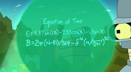 You don't often find references to navigation mathematics in pop culture. How's that for the under-statement of 2007... The attached screenshot is taken from an animated film that was released last week (direct to DVD). As you can see, they've included an equation for "time travel". It really should look very familiar to some of you! The creators of this particular series are famous for inserting obscure technical references in their films and tv series. They also famously included a dis-proof of Fermat's Last Theorem in the background of one scene: 1782^12 + 1841^12 = 1922^12. So test your knowledge: 1) what is that Equation of Time Travel really used for? 2) in the second equation, for B, where does it begin to deviate from reality? 3) how accurate is this equation as quoted (ignoring the 'wrong' part)? 4) who's that metal man leaning in to look at the equations? 5) what's the name of the film? 6) how does this screenshot differ from the frame in the original film? 7) [bonus] did they really disprove Fermat's Last Theorem? -FER http://www.HistoricalAtlas.com --~--~---------~--~----~------------~-------~--~----~ To post to this group, send email to NavList@navlist.net To , send email to NavList-@navlist.net -~----------~----~----~----~------~----~------~--~---