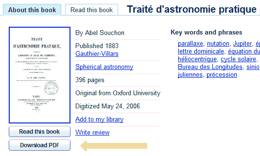 Wolfgang, you wrote: "Unfortunately the downloadable copy under this adress seems to have disappeared: http://books.google.com/books?id=TzMAAAAAQAAJ Is it another case of the stiff french copyright laws or am I just too plain dumb?" Maybe it was just a temporary thing on their servers. It was available yesterday, and it is again today. I'm attaching a small screen capture of a portion of the web page that you should see at that address (I added an arrow). -FER --~--~---------~--~----~------------~-------~--~----~ To post to this group, send email to NavList@navlist.net To , send email to NavList-@navlist.net -~----------~----~----~----~------~----~------~--~---