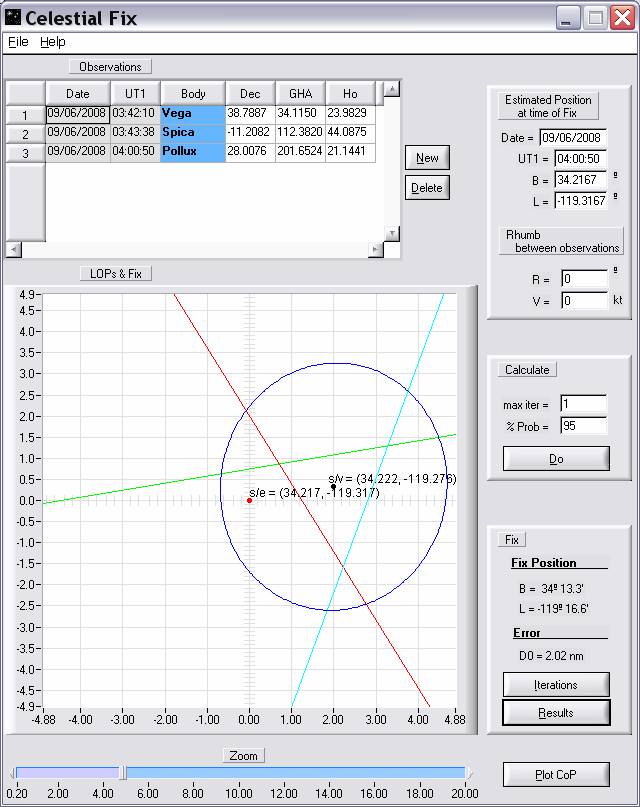 34º 13.3' N 119º 16.6' W, both, solving for 3 LoP, (DeWit , LopLSSR), and solving for 3 CoP, (Circles of Position or Circles of Equal Altitude, Kaplan)