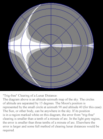 I wrote previously: "But sometimes a miracle happens. Even when the objects aren't perfectly aligned, the same almost trivial math applies. The math doesn't care whether the objects are really aligned so long as there is an equivalent case where they are in fact aligned. For example, the two objects could be separated in azimuth by 170 or even 165 degrees instead of 180 degrees, and under the right conditions we can "pretend" that they are separated in azimuth by 180 degrees, and it all works out correctly. How can this be?! Some kind of crazy voodoo? No, just good old rigorous math. It works because the altitude of the Moon doesn't matter much, especially when the observed lunar distance is close to 90 degrees or the Moon's altitude is near the zenith." I thought a picture might help to see the variety of cases where this works properly. In the attached graphic, we see the surprisingly large region of the celestial sphere where "trig-free" clearing of a lunar distance would yield near-perfect results. Note that this diagram applies when the Moon's altitude is 40 degrees. At lower altitudes, the zones are a bit smaller. At higher altitudes, they expand greatly. When the Moon's altitude is 80 degrees, they cover half the sky. -FER www.HistoricalAtlas.com/lunars --~--~---------~--~----~------------~-------~--~----~ Navigation List archive: www.navlist.net To post, email NavList@navlist.net To , email NavList-@navlist.net -~----------~----~----~----~------~----~------~--~---