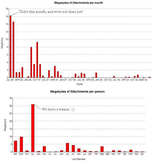 I agree with Bill that we need to keep an eye on the sizes of file attachments. There's no question that most of us find them useful, but as you can see by the attached graphs, there has been a big increase in total file sizes recently. Also, if you see your initials in the lower graph, and there's a tall bar above it, please just be careful about reducing the sizes of your images whenever you can. The grand total for attachments so far this month is slightly more than 16 megabytes, which is more than 85% of the total traffic for NavList this month. This is nothing compared to the size of a lot of other Internet content, like a short video, for example, but bear in mind that attachments are sent out to all NavList members so we're responsible for about 8 gigabytes of network traffic this month. That's like downloading ten full-length movies. So in other words, our attachments represent as much traffic as one file-swapping college freshman on a Friday night :-). But for NavList members with limited bandwidth, it's still a pain in the neck. The top graph (see attachment!) shows the total megabytes for all attachments larger than 100k sent out in the past five years. The current month is on the left. The lower graph shows attachments per person in the same period for all list members who have used attachments. Attachments smaller than 100k are not counted in the totals. NEARLY ALL of these attachments were relevant and useful. Attachments have always been used in this group, since long before I was "list owner", and the technology for producing them just gets better and better. I think this is the primary reason for the increase in file size. Incidentally, I excluded two very large attachments which were sent accidentally (one for certain, because there was a sincere apology ten minutes later, the other probably an accident since the content surely had no relation to traditional navigation --both before I was "list owner" incidentally). One specific suggestion from me personally: please try to avoid quoting back a complete message ESPECIALLY when it contains graphics or an attachment. If you send a message that says something short like "thanks" or "I agree" and you auto-quote an earlier message that is 500,000 bytes in size then you will re-send those 500,000 bytes to all list members. So have a look at your email software and see if you can figure out how to turn off auto-quoting in replies. -FER --~--~---------~--~----~------------~-------~--~----~ Navigation List archive: www.navlist.net To post, email NavList@navlist.net To , email NavList-@navlist.net -~----------~----~----~----~------~----~------~--~---