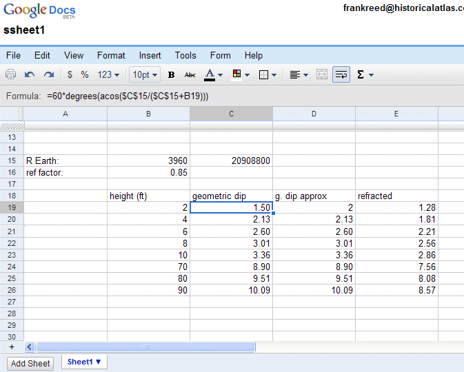 Let's see if we can make a dip table that matches the values in the Nautical Almanac using a spreadsheet. We can get the exact equation for geometric dip from simple geometry. It is dip = arccos[RE/(RE+h)] where RE is the radius of the Earth, h is height of eye, and the result is in radians so we have to convert to minutes of arc to compare with the table. There's also an approximate equation for the geometric dip which we can derive in the small angle limit. It's dip = sqrt(2*h/RE). Continuing in the same spreadsheet, in cell A15 let's put in a label: "R earth:". Then in B15, put 3960 which is the radius of the Earth in statutes miles, near enough. In C15, enter the formula =5280*B15. Skip down a few lines and let's add some labels for the table. Put "height (ft)", "geometric dip", "g. dip approx.", and "corrected dip" in cells B18 through E18. Then put some values for height in feet under the label. I selected a few special cases: 2,4,6,8,10,70,80,90. Put these in the cells directly beneath B18. Now for the formulas. Go to cell C2, and type in =60*degrees(acos(c15/(c15+b19))). Look carefully at this formula and you should be able to see that it reproduces the exact equation for geometric dip. But wait... In C15 is the radius of the Earth (in feet), but cell references are relative so if we use this formula and then copy it down, it will no longer refer to the radius of the Earth. In this case we need an absolute reference. And this brings us to another important bit of "spreadsheet-eze". Absolute cell references are created by using "dollar signs" in the formulas. So you type $c$15 to refer to that cell in such a way that it will always point to that cell, even if the formula is copied or moved. And there's a little trick, dating back to the earliest spreadsheets, that lets you cycle through the various referencing options: the F4 key on your keyboard will convert a relative reference to an absolute one. Another trick found in most spreadsheets. To edit a formula without having to re-type it all, hit the F2 key. We have our first formula for dip ready to go. It is now =60*degrees(acos($c$15/($c$15+b19))). Copy that formula and then paste it into cells C20 through C26. And there's our first little dip table. The dip formula for the (slightly) approximate geometric dip is =60*degrees(sqrt(2*b19/$c$15)). Enter that in cell D19. Copy it and past into cells D20 to D26. It's immediately obvious that the slightly approximate equation is sufficiently accurate by a long way. And yet, if you check against the almanac table, we're not really close with either equation. We need one more formula to get near the almanac table. Refraction modifies dip by some factor. So let's add a label below "R earth:". In cell A16, type "ref factor:". Then in cell B16, enter 0.85. Next below the label that says "corrected dip" enter this simple formula =$b$16*d19. Copy and paste to fill out that column. At this point it might be nice to clean up the table a little. We don't need all those digits after the decimal point. Go up to the tool bar and you will see a tool that is labeled "123". When you float your mouse over it, it says "More Formats". Mark out (select with your mouse) all the numbers in the table, go to the "123" tool and pick the one labeled "2 decimals". That should look better. And now we can finally do something useful with this spreadsheet. You can enter trial values for "ref factor" until your table matches the one in the Nautical Almanac. And just that easily you have reverse-engineered their table. -FER PS: short on time again so I have not had a chance to proof-read this. Image attached of this section of the spreadsheet --~--~---------~--~----~------------~-------~--~----~ Navigation List archive: www.navlist.net To post, email NavList@navlist.net To , email NavList-@navlist.net -~----------~----~----~----~------~----~------~--~---