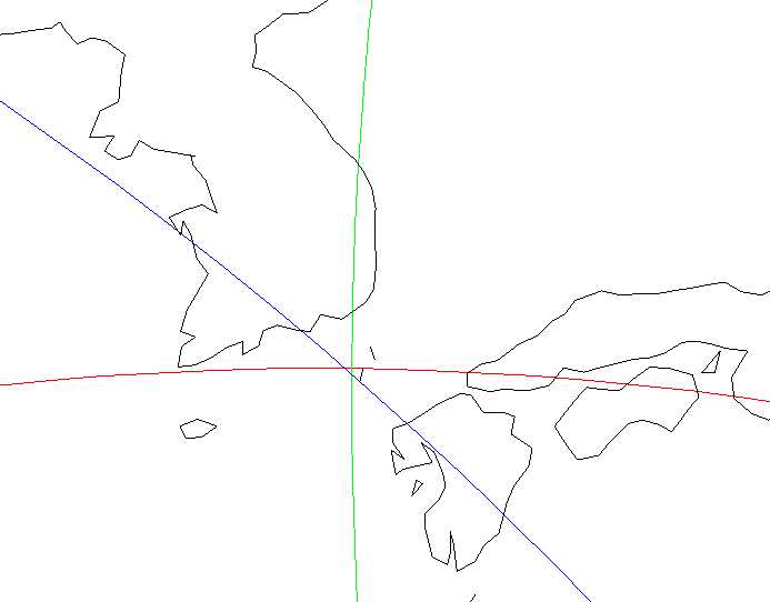 Again, I did not allow for movement of the ship. In the equal altitude plot below, red is venus, blue is the sun, and green the moon. I note the ship is moving roughly south along the green moon line so I'd say the red venus and green moon intersection and the blue sun and red venus intersection should should be moved south by about 20 seconds of latitude which will tend to reduce the triangle.