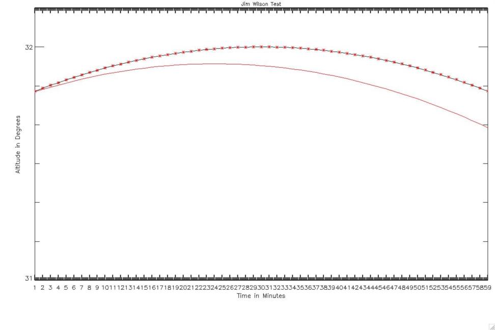 Sorry, somehow the attachment didn't get attached. Hope it is now. The red curve is from a vessel sailing north at 10 knts. The red stars show data from the moving vessel corrected to what would be observed from a stationary vessel (the black line). The excellent agreement with the exact black H-curve is quite impressive. --John --~--~---------~--~----~------------~-------~--~----~ Navigation List archive: www.navlist.net To post, email NavList@navlist.net To , email NavList-@navlist.net -~----------~----~----~----~------~----~------~--~---