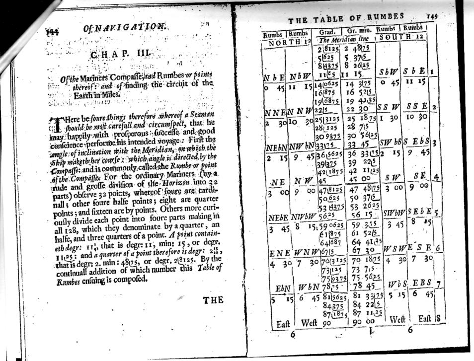 Paul Hirose pointed us to a Google of Briggs book on Logarithms, of 1624. The Latin text, in that, defeats me, but I was interested in Briggs' notation for decimal parts of numbers, which were quite a new concept in those days. Until then, the Western world had relied on fractions. The "decimal-point" (or in Europe, "decimal-comma") hadn't yet come into use, and mathematicians denoted decimal numbers in whichever way they thought best. Briggs denoted the integer part of a decimal number by slightly larger type; then the decimal part, in smaller type, was underlined. In the attachment you can see how the printer has set it out, by inseting a row of underline characters, rather raggedly, into his block. My interest comes from reading an account by Oughtred of his circular slide rule, of about 1630, which he called his "Circles of proportion", comprising 11 concentric scales, finely inscribed on a brass disc 18 inches diameter. The book has an addendum concering his navigator's version, which is the instrument held at the Museum fot the History of Science in Oxford. That version has a two-turn scale of meridional parts, two turns (decades) of log sines (of angle from half-a-degree to 90), and four decades of log tans, from half-a-degree to 89.4. It was intended for handling the navigational problems of rhumb-line sailing, but not (as far as I can make out) to handle the great-circle calculations that the Bygrave is designed for. Nevertheless, I imagine that with a bit of fiddling, by taking complements of angles, a similar 3-step process to that used by the Bygrave might be implemented. But all that is by-the-way. What I wanted to ask about concerns a translation from his original Latin of Oughtred's 1632 book about his Circles of Proportion. It's the second, corrected, translation, this one by Arthur Haughton, of 1660. It's been digitised, by EEBO (Early English books online) but only available to subscribers, such as university libraries. And my question has little to do with navigation itself, but with Oughtred's notation for decimals, which is, I think, the same notation that was being used in the earlier documents of 30 years before, just a few years after Briggs. Oughtred goes to some trouble to explain about decimals, and his notation involves drawing an L-slaped line, the vertical stroke coming beteen the units and tenths digits, when it bends to the right to underline all of the decimal-part. You can see many instances in the attachment, oughtred.jpg. What I found so interesting was that all these L-shapes differ, noticeably. Of course, you expect the horizontal stroke to be of different length, for differing numbers of decimal digits, but it's more than that. Sometimes, the bend of the L is sharp, in others, it's rounded. Sometimes, the "horizontal" arm is casually sloping, by different amounts. I wondered how these marks had been put into my copy, and indeed, whether they had been laboriously drawn in, in manuscript, after printing. By a stroke of luck, the museum happened to have a second copy of that same edition. [It's hard enough to lay hands on a 17th century book, never mind finding two identical copies in the same place] And indeed, those L marks, in the two copies, were identical; they had indeed been printed. So now, at long last, I get to my question. HOW were they printed? The museum librarian hazarded a guess that the printer had somehow inserted bits of bent wire into his block, to pick up the ink and transfer it. But how would they be held in place? Does anyone know enough about printing to make a guess? Life, for printers of such technical matters, must have got a lot easier once the decimal point came in. The attachment itself is interesting to navigators, in its content. It shows the four quadrants of the compass, each divided into 32 "rumbes", but those angles are precisely split up, and given in two alternative decimal notations. Either as decimal degrees, starting at 2.8125 degrees, or as degrees and decimal-minutes, starting at 2 degrees 48.75 minutes. Oughtred was a long way ahead of his time, in decimalisation. George. contact George Huxtable, at george@hux.me.uk or at +44 1865 820222 (from UK, 01865 820222) or at 1 Sandy Lane, Southmoor, Abingdon, Oxon OX13 5HX, UK. --~--~---------~--~----~------------~-------~--~----~ Navigation List archive: www.navlist.net To post, email NavList@navlist.net To , email NavList-@navlist.net -~----------~----~----~----~------~----~------~--~---