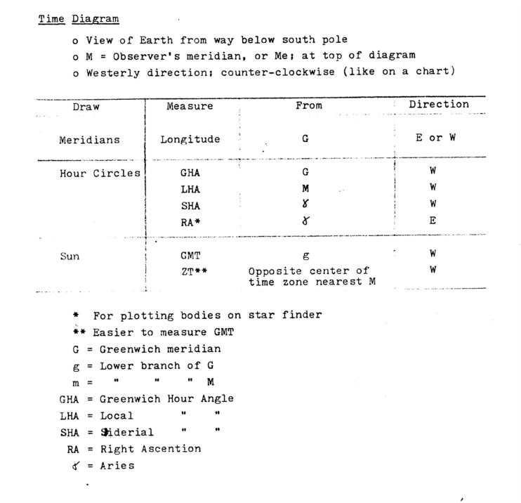 A word of caution about time diagrams--my students have consistently had difficulty with them, so I conclude that they are not easy to understand. I hand out the attached to try to help them. Re: the title of this post-- the formula to compute LHA is on the first page of the explanations in the Nautical Almanac. Page 254 in my edition. Jim Wilson ____________________________________________________________ Win the battle of the bulge with great liposuction solutions. Click now! --~--~---------~--~----~------------~-------~--~----~ Navigation List archive: www.navlist.net To post, email NavList@navlist.net To , email NavList-@navlist.net -~----------~----~----~----~------~----~------~--~---