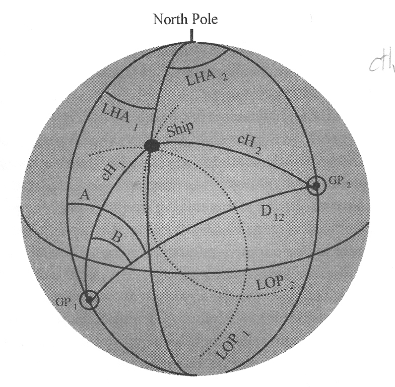 John Karl wrote, in [10556] "George, and others who may be interested -- Remember we navigators are sensitive to terminology (negative longitudes, assumed positions, dip, index mirrors, etc.). So please don't call the two fixes "ambiguous" in the 2-body problem. The key point that everyone needs to agree on is, that, given only the altitudes of two bodies and their coordinates, there are TWO UNAMBIGUOUS fixes. Other than outside information, no computer code, no reformulation of the equations, can distinguish between these two fixes. Does anyone on the List disagree with that?? If so, tell me where I'm going astray." ================== Well, I agree with the last bit, that "Other than outside information, no computer code, no reformulation of the equations, can distinguish between these two fixes." And to me, that's an example of the very meaning of the word "ambiguity"; that there are two possible answers, and the ship can only be at one of them. Am I misunderstanding the meaning of that word? Is John? His objection to it is as mysterious, to me, as his continued, and repeated, objection to the word "assumed position" in St Hilaire's method. These semantic questions seem a bit of a distraction from the reality, though I concur with John that we should try to agree about the meaning of the words we use. Anyway, until I can find a better word, I will continue to use "ambiguous" in that context of the two-body fix. And in solving that problem, two levels of ambiguity arise. First, the one that John refers to above, that can only be resolved by the navigator knowing roughly where the ship is. And a second level of ambiguity, that arises in deducing a local hour angle from its cosine, which is less serious in that it can be resolved by logical procedures only, and needs no navigator's judgment, as I will show later. ================== John wrote in [10496] ." It should be apparent both from Fig 7.3 and from Eqs 7.5a-e, that these five equations do not contain information on the zero of longitude. Thus they can not determine longitude, which must be determined from another source -- such as the navigator." and again, in [10511], "...the fact that no set of equations derived from Fig 7.3 can determine longitude because there is no longitude information in the figure". I don't follow that. Surely, those equations determine LHA1, although with an ambiguity between two possible values. And GHA1 is known. Then longitude is the difference between them, as shown in 7.5f. , Lon = LHA1 - GHA1. Simple as that. Yes, we know there will be two solutions, the two crossing-points of the circles, and choosing between those is where the navigator's judgment comes in. But there's no extra ambiguity, on top of that one, that calls for a navigator's judgment to resolve, if we go about the problem in a careful way. ================== Attached is fig 7.3, from John Karl's nice book, "Celestial Navigation in the GPS age", page 79 in my 2007 edition. It shows position circles around two stars, star1 above GP1, star2 above GP2. The ship must be at one of the two intersections of those dotted circles. The radii of those circles are marked cH1 and cH2, referring to the co-altitude, or Zenith distance, of each star, though the resulting equations use the altitudes H1 and H2, where H1 = 90 - cH1. The only thing I would question, in that diagram, is the way LHA2 is marked. Hour angle of a body is always measured westerly from the observer, but here it's shown going easterly. I doubt if that matters, much. The declinations of the stars, d1 and d2, aren't shown as such on the diagram. I will follow John's notation, and use the same (Gauss) equations, but be a bit more rigorous (in my view) in defining some angles. The ship can be anywhere in the world, the star GPs can be anywhere visible from the ship (i.e. within 90 degrees) and the stars can be freely labelled 1 and 2, without worrying about which star is east of the other, or of the ship. There can be an advantage in labelling star1 to be the one with azimuth furthest from the observer's North-South line, but it's not a requirement. 7.5a and 7.5b deal with the spherical triangle GP1 - N Pole -GP2. 7.5a determines cos D12, the great-circle distance D12 between GP1 and GP2. angle. As this arc-length can only be in the range 0 to 180 degrees, no ambiguity arises in taking arc-cos to get D12. 7.5a is cos D12 = sin d1 sin d2 =cos d1 cos d2 cos (GHA1 -GHA2). GHA1 and GHA2 are both measured Westerly from Greenwich, and we will need to note the sign of their difference. An easy way to specify that test is to see if sin (GHA1 - GHA2) is negative, in which case GP2 is west of GP1. The numerical value of that sine isn't needed, just its sign. In 7.5b, we're going to specify angle A more carefully, as the bearing from GP1, measured clockwise from North, of the great circle passing through GP2. Equation 7.5b is- cos A = (sin d2 -sin d1 cos D12) / cos d1 sin D12 but next we introduce a step- if sin (GP1-GP2) is negative, A = 360 - A. A is now in the correct quadrant, with no ambiguity. It can be anywhere from 0 to 360 degrees. Next we switch attention to spherical triangle GP1 - ship - GP2. Angle B is determined from 7.5c cos B = (sin H1 - cos D12 sin H1) / sin D12 cos H1. Because it's taken from an arc-cos, B has two solutions, equal in value, somewhere between 0 and 180 degrees, but opposite in sign. Because we will use both solutions, we don't need to bother about defining a direction in which angle B is positive. Next, we need to look at spherical triangle GP1 - N Pole - ship. In this, it will be convenient to refer to the angle C, not marked as such on the diagram. This is the great-circle bearing of the ship from GP1, measured clockwise from North, 0 to 360 degrees. Clearly, C has two possible values, which we could label Ci and Cj, depending on the sign of B from equation 7.5c. Ci = A-B Cj = A+B which correspond to the ship being at two crossing-points. Only one of those is sh