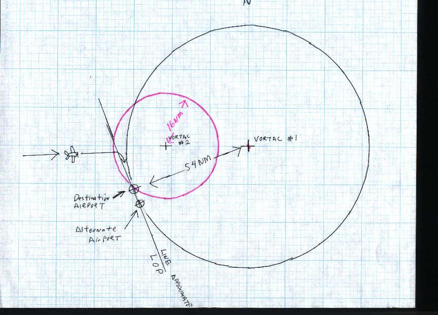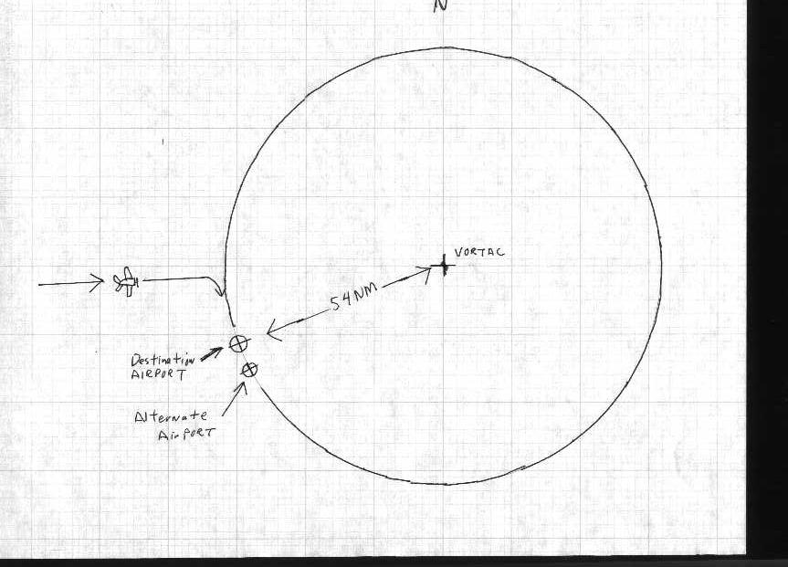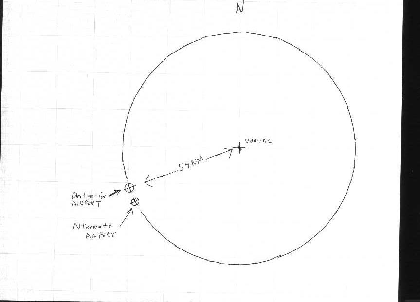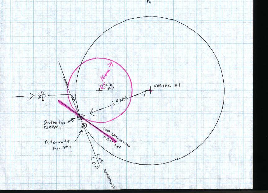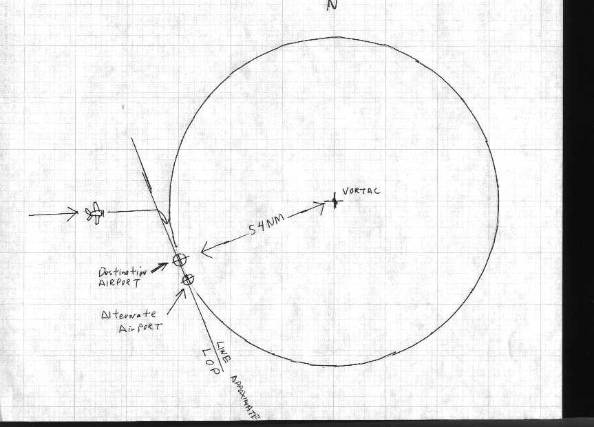 So how can this help him find an airport? He looks on his chart and sees that there is a VORTAC located northeast of the airport and he measures the distance on the chart from the VORTAC to the airport, say 54.0 NM. Now this is important for understanding the use of an LOP for finding an airport. He now knows that if his airplane is directly over the airport his DME will read 54.0 NM, if it reads anything else he cannot be over the airport. Of course his DME will read 54.0 anywhere else on the circle too so just this information won't allow him to head directly to the airport. But he knows that if he intercepts the 54.0 DME arc and follows it all the way around he will eventually pass directly over the airport. So our pilot takes up a heading that will take him north of the airport and when his DME shows him on the 54.0 DME arc he turns to go south following the circle and making corrections so that his DME reading, 54.0, will always be the same as what the DME reading would be if he were over the airport at that time. If, by chance, there just happens to be another airport exactly 54.0 NM from this same VORTAC that lies beyond the destination airport, on the DME arc, if the pilot misses his destination (perhaps a cloud obstructed his view at the critical point) if he then continues to maintain the same 54.0 DME reading, this circular LOP will take him over the second airport. This is Ric's espoused theory.