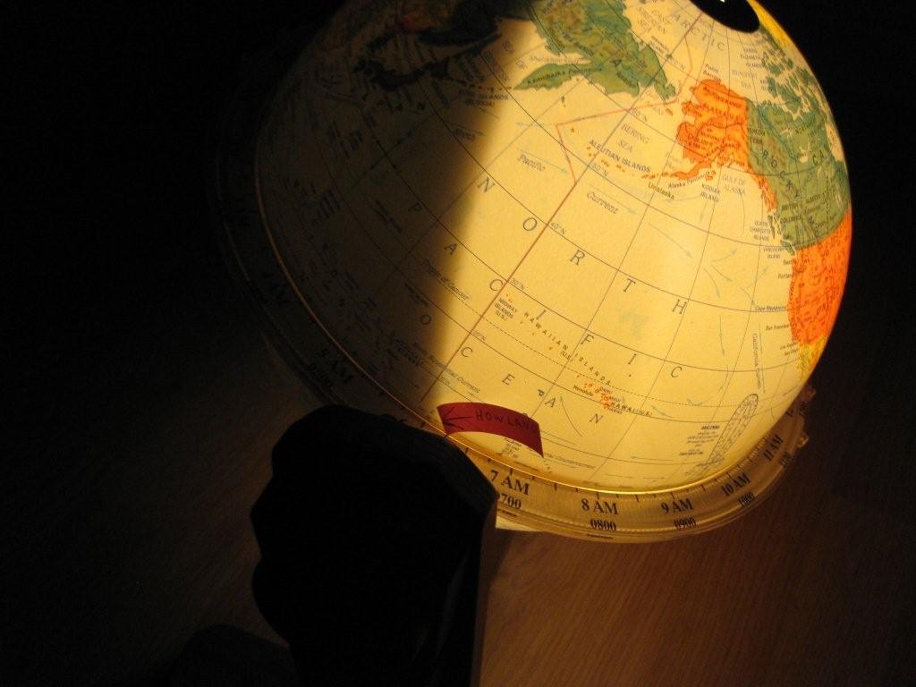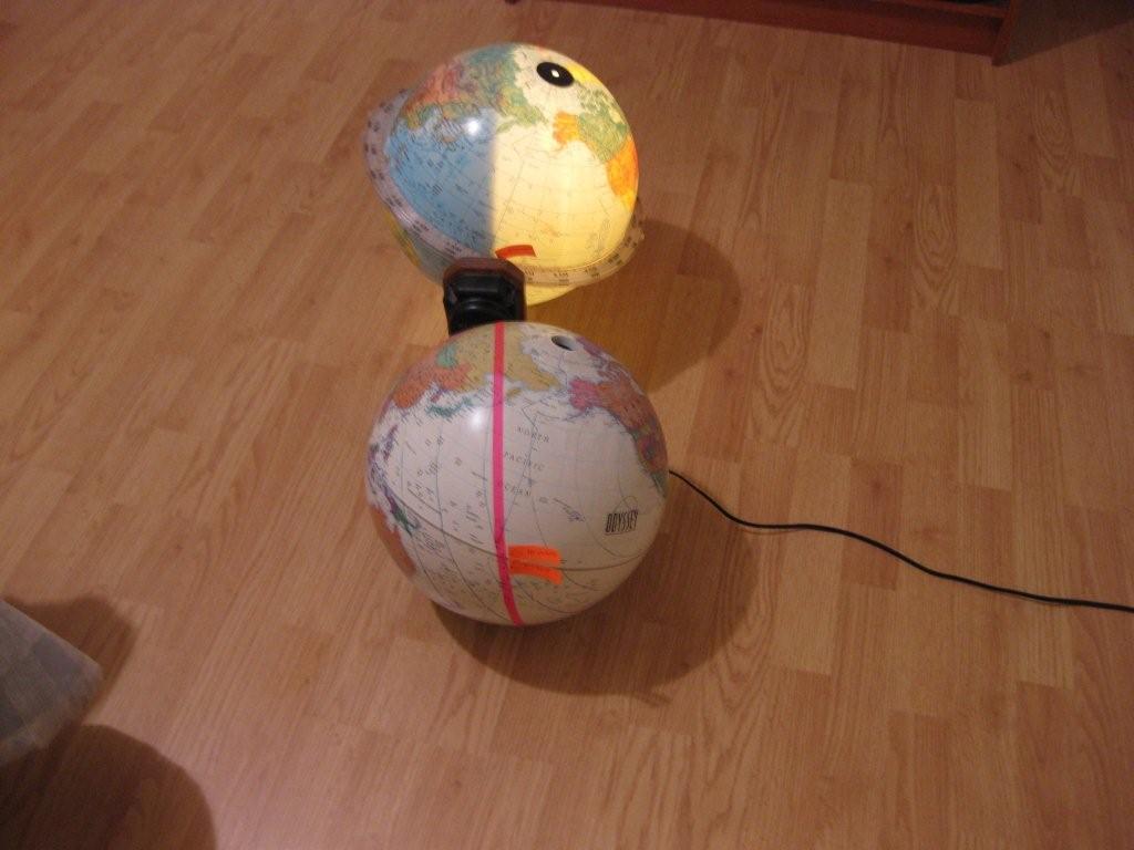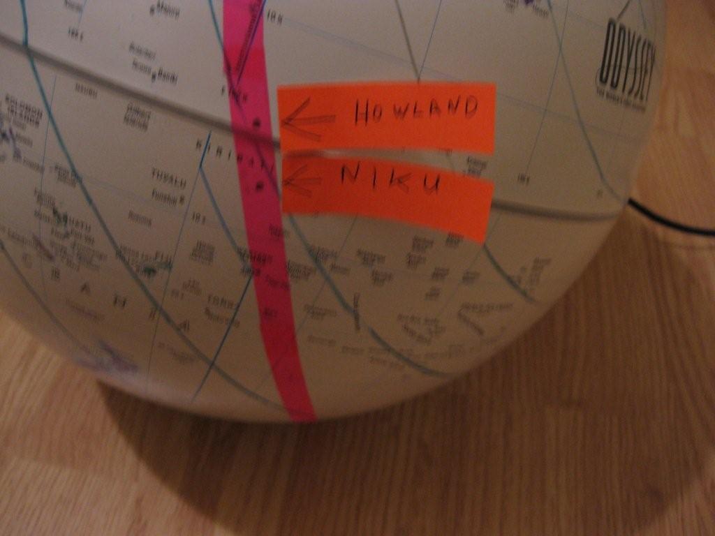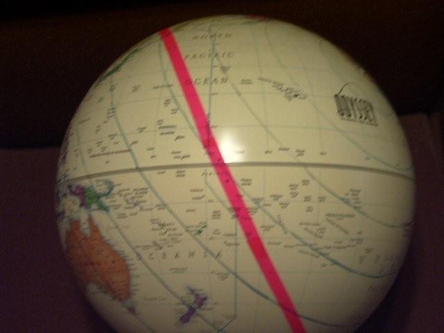 The globes illustrate the "sun rise" LOP. The first globe is special in that it is actually a clock that shows the time everywhere on earth and it rotates once every 24 hours. It can also show the area of night and day for any time on any day of the year. It contains a light and a shield the shades one half of the globe from the internal light so as the globe turns you can see where the edge of the line is where night gives way to daylight (sunrise) and vice versa (sunset.) The tilt of the axis is also adjusted to allow for the change of the sun's declination (it's latitude) as it changes throughout the year. I set it for 1749Z (the Greenwich meridian is the index for Zulu time) and for the day of the year to tilt the axis for the sun's declination. You can see that the sunrise line runs northwest through Howland but you can also see how this line changes direction depending on the relationship to the sun's GP which is marked in the Gulf of Mexico. I then transfered this line to the other globe which I marked with the pink marking tape.