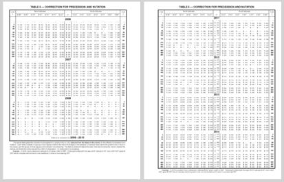 It looks like you are making it too hard. I always come back to to the question, "how accurate do you need your position to be?" If you can tolerate an error of up to one NM then you can use one set of star positions for at least one year on both sides of the date of the star positions.To improve on this you do not need a separate precession correction for each star since the correction depends on latitude, LHA Aries and azimuth. I have attached the precession and nutation correction table from H.O. 249 volume one, epoch 2010. This volume is based on the position of the stars on January 1, 2010. It shows no correction is needed for the years 2009 or 2010, the period of one year before to one year after the date of the star positions. Since H.O. 249 is accurate to one minute this means that there are no errors exceeding one minute if no precession and nutation correction is applied for this two year period. You can also see that the correction is only one minute for an additional year on either side, 2008 and 2011. I have also attached the P&N table for epoch 2005 which displays the correction to one-tenth of a minute ( I don't have the same table for the epoch 2010 volume) to use as an example that we could also expect in epoch 2010. You can see that the corrections for 2004 and 2005, plus and minus one year from the January 1, 2005, the date of the star positions for epoch 2005, don't exceed .6' and for the next year, 2006, they don't exceed 1.3'. So using the December 31, 2009 star positions for all of 2010 will not result in "errors of a few minutes of arc" that you are worried about. gl frankreed@HistoricalAtlas.com wrote: > Gary, you wrote: > "It's an exact correction to GHA Aries" > > OK, but does it really do you any good? What you really need is a precession table for each of the navigational stars. And we don't even need to think of it as a pure precession table. If there's a longer interval involved, it could include proper motion. But it's nothing complicated and not hard to produce. The point is that it's some number of minutes of arc for each star's SHA and Dec. And then you throw in the correction for GHA Aries and add them up as usual to get the position of the star. But correcting GHA Aries alone while leaving out the corrections for the individual stars doesn't help. So instead, the Aries correction can just be lumped in with the other tabulated corrections for the individual stars. Algorithmically, > > we can do either: > Dec*(2010) = Dec*(2006) + dDec* > GHA*(2010) = [GHA Aries(2006) + dGHA Aries] + [SHA*(2006) + dSHA*] > > or: > Dec*(2010) = Dec*(2006) + dDec* > GHA*(2010) = GHA Aries(2006) + GHA*(2006) + dGHA* > > It's not much of a difference --saves one step. But no matter what, we still need a table of dDec* and either dGHA* or dSHA* for all the navigational stars. And again, it's not hard to make one. Or you can just accept errors of a few minutes of arc, or just not use the old almanac for the stars at all. > > -FER > > -- NavList message boards: www.navlist.net Or post by email to: NavList@navlist.net To , email NavList+@navlist.net