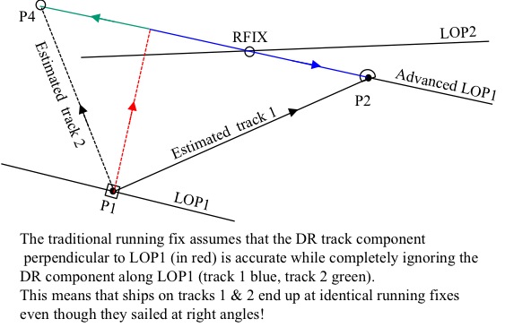 Come on you guys, this has nothing to do with radar, loran, or any other navigation system. It has nothing to do with terminology, DR versus EP, etc, It has nothing to do with teaching. It concerns the validity of the traditional running fix concept. In the figure below, the location P1 is where the navigator #1 thinks she is when LOP1 is acquired. To the best of her knowledge (her best guess, for whatever reason) she believes the effective track (track 1) took the ship to P2 when LOP2 is acquired. The standard running fix places the ship at RFIX. Again, I observe that the this traditional running fix assumes that the estimated track perpendicular to LOP1 (in red) is completely accurate while the component parallel to LOP1 (in blue) is completely without value. I ask again, can anyone refute these these assumptions?? Can anyone justify them?? JK -- NavList message boards: www.navlist.net Or post by email to: NavList@navlist.net To , email NavList+@navlist.net