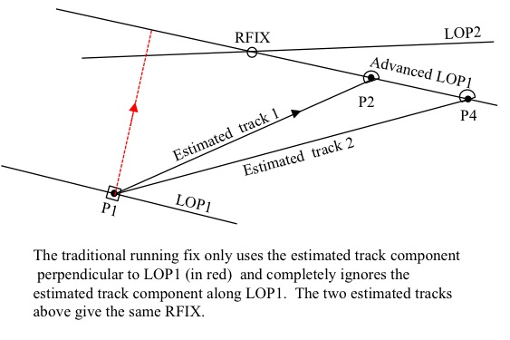 I'm a bit surprised that no one can agree (or can see) that the standard running fix uses only the perpendicular component of the advance of LOP1, while completely ignoring the component of the estimated track parallel to LOP1. This is easily seen in the figure below, it is central to the construction of the standard running fix, and it depends on absolutely nothing else.