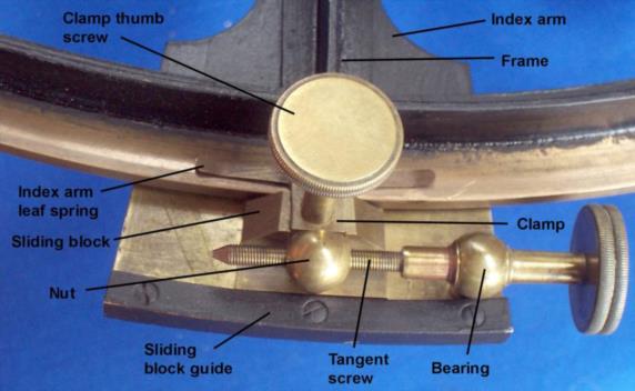 In contemporary books, only the tangent screw and the clamp seem to be named, so in attempting a detailed description for my book (The Naked Nautical Sextant), I invented some terminology which I hope is apt. I am attaching a picture which shows the layout for most nineteenth century sextants. There were some variations, but the principles remained the same except for some Brandis sextants, which used an early, and unsatisfactory, eighteenth century arrangement. C Plath and Hughes and Son added some refinements that must have increased the cost for no particular gain.