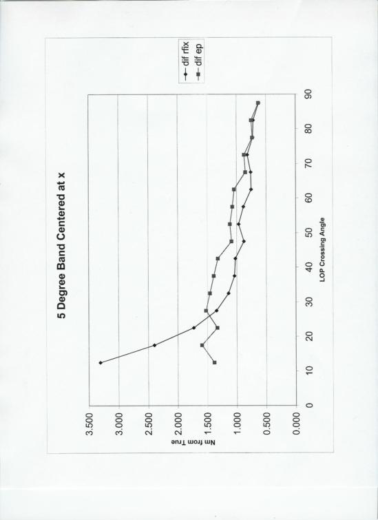 First, a plot of average distance from true postion to Rfix or EP in nautical miles. This shows a number of things. When the crossing angle between the two LOP's is small, the traditional running fix can produce large errors. Not surprinsing. In fact, well known and expected. (And reassuring to find in the result!) When the crossing angle between the two LOP's is small, the EP does well. Not surprising after a little thought. The EP is "anchored" by the DR and doesn't get too far away. At 90 degrees, the two methods give the same result. Again, expected and reassuring to see. Interestingly, for crossing angles between about 25 degrees and 90 degrees, the traditional running fix method gives better results.