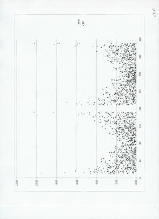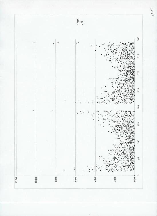 Next, is a scatter plot showing error in nautical miles as a function of crossing angle between LOP's. As expected from the above, when the angle is near 90 (or equivalently, 270), the error is lower. At 0 (or 180) the errors in Rfix are large. (In fact there were Rfix values off scale at very small crossing angles, but the scale was chosen so as to provide a 'reasonable' view over the range of anagles.)