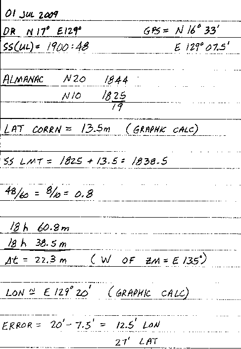 Attached is my solution to Jeremy's data. Author's method is fine for the intended purpose - emergency navigation - let's not try to do brain surgery with a chain saw. I get W 61d 05m for his example, using my graphic calculator. No electrons died when doing my solutions.