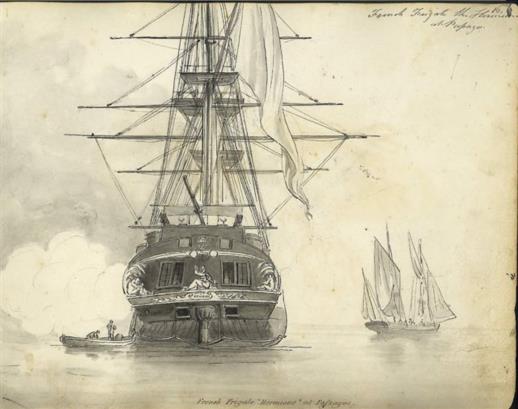 A week ago, Andres attached some interesting picture of French warships, adding- "The pics of vessels are from: Richards and Thomas HORNBROOK were two British soldiers who produced a series of drawings, watercolours and prints that illustrated their experiences in the Basque Country during the First Carlist War." It's a bit surprising, to me, that there's been no response from Navlist members, and I will copy the pictures here again so as to give the chance for a second look. Although I hadn't come across the marine pictures of the Hornbrook family before (I'm not well-up in art), it seems that they are quite well known marine artists of the early 19th century. As I understand it, Richards was the father. There was at least one other marine artist in the family, John, probably another son. It seems that Richards (and maybe Thomas, also) wasn't exactly a British soldier, as described, but actually a Marine. These were armed men, who, on British warships, were housed between the officers' quarters and those of the crew, and one of their functions was to keep them apart, the crew being often regarded as a greater enemy than the enemy. The marines were often cordially hated by both sides. They seldom took much interest in ship-matters, but Hornbrook was clearly an exception; those drawings show a fine understanding of ships' rigging and how it worked. What's unusual is for any British military personnel to find themselves able to make such detailed pictures of ships of the old enemy, France. I think the unusial occasion was when a British detachment found themselves in cahoots with the French (and much of Spain) against a common enemy, the Basques, in the 1830s, and besieged Bilbao. In those circumstances, the Basques didn't have much of a chance. Two of the pictures were marked with a location, which looks to me like "French Passages". I wonder if Andres has any notions as to where this might be. The really dramatic picture is 3227, which has presumably been presumably imagined, though such disasters did happen in reality. It shows a collision between two ships-of-the-line, likely French 74s, in a crowded stormy anchorage. One, with all sail firmly stowed, has fallen athwart the bows of another, destroying her beakhead and bobstay gear and allowing the bowsprit to cock upwards. That carries all the forestay rigging holding up the foremast, which has fallen aft, and is in the process of taking the mainmast with it, the mainstay having parted. That was one of the weaknesses of such bark rig, that the masts were so dependent on each other. What is rather curious is this. There's an anchor to be seen, hauled up to the cathead, but no other sign can I see of a cable to another anchor. Yet all sails have been given a harbour-stow, so the vessel wasn't in the process of coming to anchor, or deliberately leaving the anchorage, but expecting to remain anchored. So, presumably, the anchor must have dragged (but then the cable would still be seen), or else the cable has parted at the foc's'le, which seems the most like cause. The other anchor must then have been catted as an emergency measure, to drop when she has found clear swinging room. An intriguing picture anyway, and thanks to Andres for providing it. George. contact George Huxtable, at george@hux.me.uk or at +44 1865 820222 (from UK, 01865 820222) or at 1 Sandy Lane, Southmoor, Abingdon, Oxon OX13 5HX, UK.