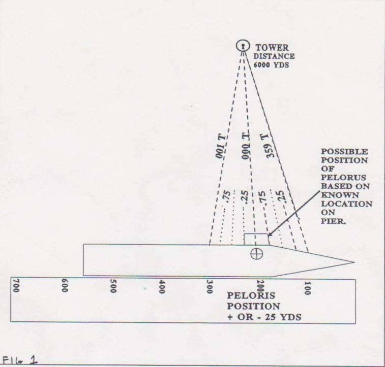 There are two generally accepted and practiced methods of determining gyro error while the ship is still moored to the pier. Each method has validity as well as certain inherent problems. The first is by celestial observation using the Sun or Polaris. An Azimuth of the Sun is accomplished by obtaining a bearing to the body, noting the time and observers position, and utilizing the reduction tables or suitable calculator/computer programs a comparison is made to what the body should bear, any difference is then Gyro error. In addition to a rather lengthy calculation process these methods have an accuracy that is questionable beyond one half of a degree. Additionally these procedures are usually done a significant time prior to the ship getting underway, this can leave doubt as to whether there has been any changes to the original determination. The second method is the pier side fix or trial and error method. Here a fix is taken by utilizing three or more LOPs, if these results in a pinpoint fix then gyro error are assumed to be zero. If however, a triangle results, equal amounts of an assumed error are applied to each LOP until a pinpoint fix is achieved. This method again is time consuming and if the objects used for the fix are a relatively short distance away an error may not be apparent even though one exists. An easy and accurate method does exist which utilizes the Rule of Sixty (Radian Rule). Since a Radian measures just under 60 degrees we can assume that it represents one-sixth of a circle. If we know the distance to an object, then we know that we are on a circle which has a radius of that distance from that object. Next by dividing that distance (radius) by sixty we can identify what each degree of bearing along that portion of the circle is worth in terms of distance. This can be used for many purposes. One use is a quick and accurate way to determine gyro error. All that is required is to estimate your position alongside the pier, determine how accurate your position is known + or - 10, 15, 20 yds etc. Once this value is known double it and multiply by 60 ‘ result is the minimum distance you want an object to be in which to obtain a bearing to. In our example we ye determined our position on the pier to be within 25 yards, doubling that amount we get 50 and multiplying 6 0 we get 3000. Any object we use must be at least 3000 yards away to obtain the accuracy we need. In fig 1.1 the tower is 6000 yards away so it meets our criteria. Looking at the chart the towers bearing should be 000 degrees true. Knowing that it would take 100 yards (6000 yds divided by 60) of movement at right angles to the tower to change its bearing by one degree any difference in an observed bearing will be gyro error known to within one fourth of a degree. The shaded area in fig 1 represents the possible location of the pelorus since the position was estimated to be within 25 yards (one fourth of 100). Assume that our observed bearing was 359 degrees per gyro compass. The true bearing from the chart should have been 000 therefore a one degree east error (gyro least error east) is present that is known to be accurate to within one fourth of one degree because the true bearing to the tower could be from 359.75 to 000.25 degrees. This explains why the pierside fix can be misleading, assume all LOPs used were at a distance of less than 2000 yards, if an error of one degree was present the resulting LOPs would have a visible error on the chart of less than 35 yards (2000 divided by 60). This would not cause much alarm on most harbor charts, however once off the pier where more distant objects are used this error (still unidentified) results in triangles and low confidence fixes. Another use is shown in fig 2. Here an anchored vessel is observed ahead of our track, a channel buoy and a point of land are also observed, all of which are at an approximate distance of 2000 yards (obtained from radar). We desire to know how much distance is between the ship and the buoy and the ship and point of land (Distance between objects)(DBO). From the pelorus we observe an angular separation of 10 degrees. Therefore we can quickly compute that there is approx 333 yards DBO. (2000 divided by 60 = 33, 33 times 10 = 333. Between the ship and the land we note there is 15 degrees of separation so we can quickly determine 500 yards DBO (2000 divided by 60 = 33, 33 times 15 500). This technique can be of great assistance to Commanding Officers, Navigators, OODs and other bridge personnel.
