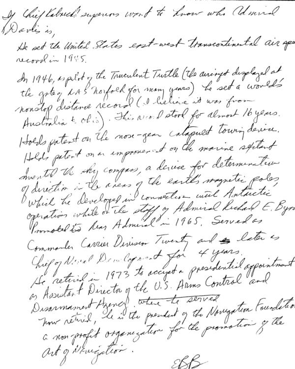 In my papers from Ernest Brown, I found some interesting information on The Adm. The ADM. was to come to Newport to meet QMCS Kabrick and myself and present an award to QMCS Kabrick for the start of a new " best Navigation Instructor for the year from "NAVIGATION FOUNDATION."