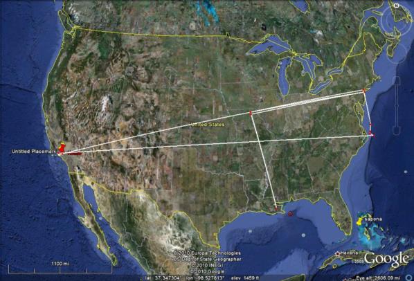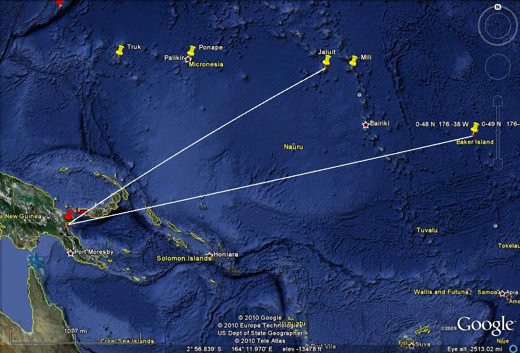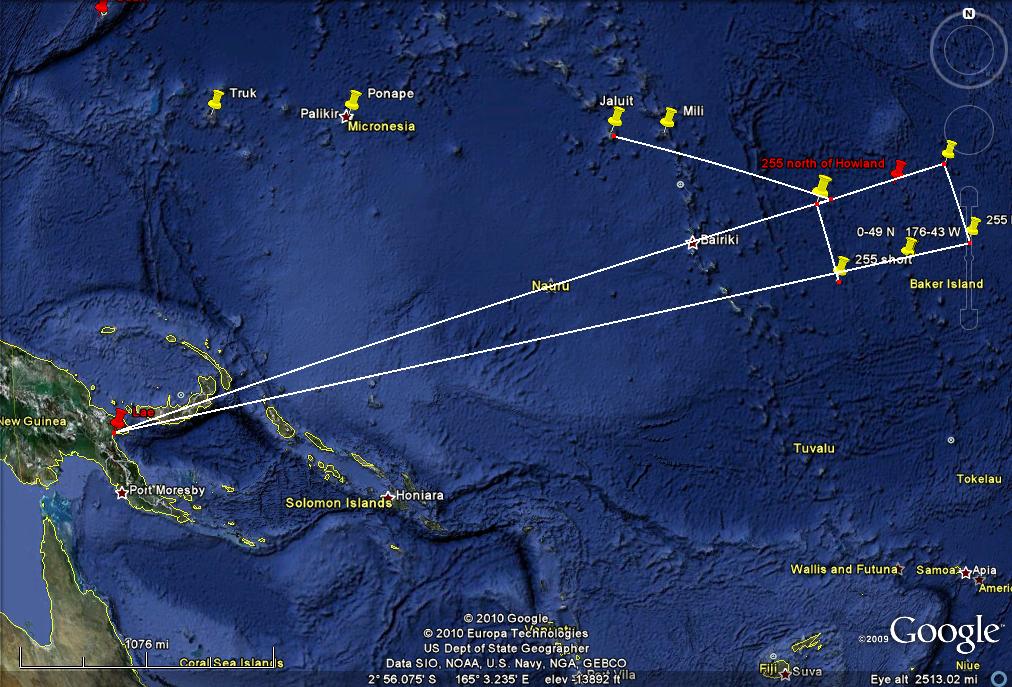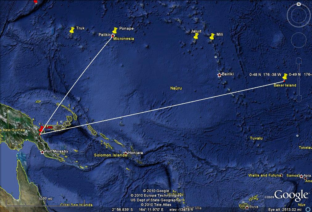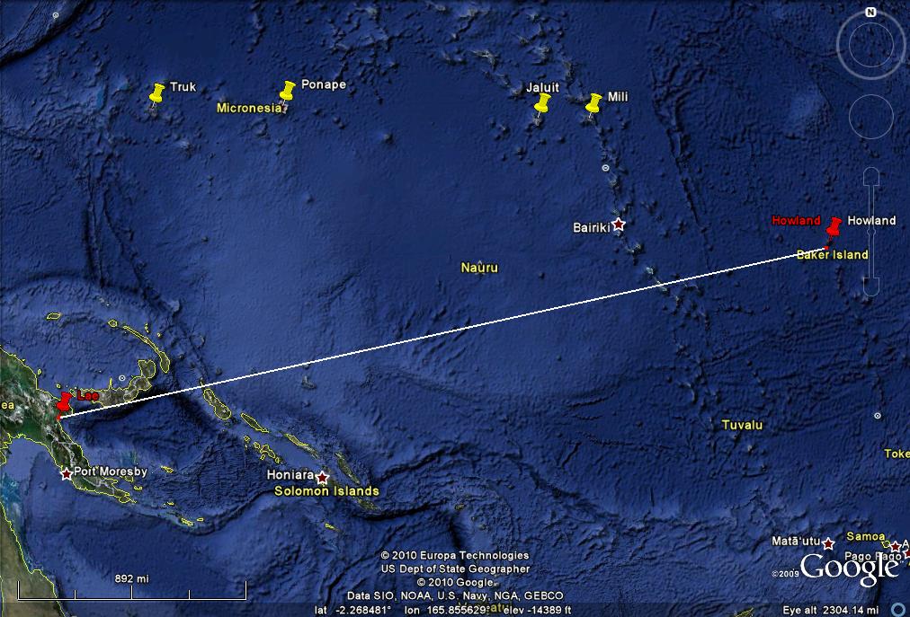 I wrote before: "There have been many who have claimed that Earhart was on a spy mission when she disappeared and have raised Earhart’s role in gathering intelligence about Japan’s actions in the Mandated Islands. (I do wonder however if any these theories were advanced prior to the 1943 Rosalind Russell movie, Flight For Freedom, which had that story line.) I decided to look at this from a piloting and aircraft performance point of view. It turns out that there are actually two different theories. One, that she was a spy herself, flying over the Japanese held Islands and taking pictures of their installations with cameras hidden in her airplane. A second theory is that she was not taking pictures herself but that she would stage a disappearance to give the U.S. Navy the excuse to search the Mandated Islands so that the Navy could take pictures of Japanese installations. We need to look at these two different theories separately. " -------------------------------------------------------------------------------------------------------------------------------------- Now lets look at the second theory, that she was to stage her own disappearance to give the U.S. Navy a justification to search throughout the Japanese Mandated Islands. Let's see if this would have worked by looking at it from the flight navigation point of view. The distance from Lae to Howland is 2556 statute miles and the course is 078 degrees true (image 6.) ( I state all courses in relationship to true north instead of magnetic north, true directions, not magnetic directions and distances are in statute miles.) Images 12, 13 & 14 show the courses to Truk, Ponape and Jaluit. (I am not considering Palau since it is so far off course.) The course to Truk is 18 degrees meaning the plane would have to be 60 degrees off course to get to the vicinity of that island. The course to Ponape is 38 degrees, off course by 40 degrees. To Jaluit is 60 degrees, 18 degrees off course. Another way to look at this is to see how many miles off course they would be if they were in the vicinity of those islands. Image 15 shows the perpendicular distances from the course to Howland to the various islands. Truk is 910 miles off course, Ponape is 770 and Jaluit is 580. The commonly accepted level of uncertainty of in-flight dead reckoning is 10% of the distance flown. So even without a navigator on board and with Earhart doing her own dead reckoning navigation, just holding a heading based on correcting for the forecast winds, and with no fixes in flight, no celestial fixes and no visual fixes over an island, she should not have been off course more than 255.6 SM either to the north or to the south of Howland. Image 16 illustrates the area she might have been expected to overfly on her way to Howland if using just dead reckoning. It extends 255 miles north of Howland which is about 6 degrees off the course to Howland. (A like area would be south of course but that is not important to this discussion.) Even though the area of course uncertainty extends 6 degrees either side of course, you are more likely to be closer to the course line than to the edges of the area. The probability drops off gradually as you move further away from the course line. With a navigator on board, obtaining celestial fixes fairly regularly, the plane should be very close to the course line and it is unlikely that it was ever near the edge of the area of course uncertainty. Image 17 shows how far off course in excess of the area of course uncertainty it would be to go to the islands. Since the course uncertainty is 6 degrees these numbers are six degrees less than the previous numbers, 54 degrees to Truk, 34 to Ponape and 12 to Jaluit. The 10% area of uncertainty expands in the along course dimension too. Even though the airplane (using dead reckoning) may have flown through the course uncertainty area it is not going to be near the western end of it since they flew through that area many hours prior to the last transmission. The plane is not likely to be more than 255 miles short of Howland nor likely to be more than 255 miles past Howland. Image 18 shows the final area of uncertainty (with the area south of the course line omitted. It would be the same size as the area north of the course line.) Like the uncertainty in the course, the plane is more likely to be near the center than near any of the edges. Again, with a navigator on board, the uncertainty would be much less. Image 19 shows the line from Jaluit to the nearest corner of the final area of uncertainty. This distance is 670 SM. It is slightly less to Mili, 530 miles. It is 1460 to Ponape and 1880 to Truk. The Japanese also understood navigation. It would be very difficult to convince them of a legitimate need to search near Truk, 1880 miles from the outer limits of her likely position or even to search near Mili, fully 530 miles away. To put this into perspective, image 20 shows an analogous situation projected onto the U.S. If I were to disappear while flying my plane from Los Angeles to New York my family would have a very hard time convincing the police chief of New Orleans to make a search for my plane in the swamps nearby. New Orleans is 780 miles off course, about the same as Ponape. Since the U.S. planners would have been aware that they would not be able to pull the wool over the eyes of the Japanese, there is no reason to believe that they would have attempted this deception. gl