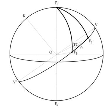 Where P1 and p2 are two points on the GC and theta is