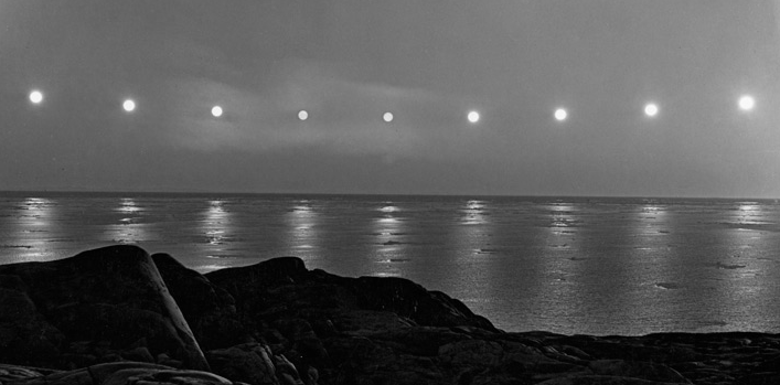 I measured the diameter of the central Sun image in pixels. That's about 8 pixels at the scale displayed on the web page. Then I counted pixels from the Sun's LL to the horizon. I get 66. Given the Sun's diameter of 32', the altitude of the Sun's LL is about 264' or 4.5 degrees +/- 0.25 degrees (my estimate of the uncertainty in the scaling based on the Sun's diameter). We can also count pixels from the right-hand limbs of the two central Sun images and for that I get an angle of 5.1 degrees which fits well with the caption's statement that the exposures were about twenty minutes apart. I'm figuring a net of near zero for dip, refraction and SD so the corrected altitude of the Sun's center is again just about 4.5 degrees. That minimum altitude of the Sun below the pole, along with the latitude of 78.5, implies that the Sun's declination was 16.0 degrees +/- 0.25d. The date then would be near 15h GMT August 9, 1947 +/- one day. Local midnight at Refuge Harbor, Greenland would be around 0500 GMT. That rules out Aug. 8 so the time was either 0500 on August 9 or 0500 on August 10 (Greenwich dates). Again, I am assuming that this photo was taken in summer, after the solstice. The same declination would have occurred around May 5. I would expect more ice around that date, so I am going with the August date.