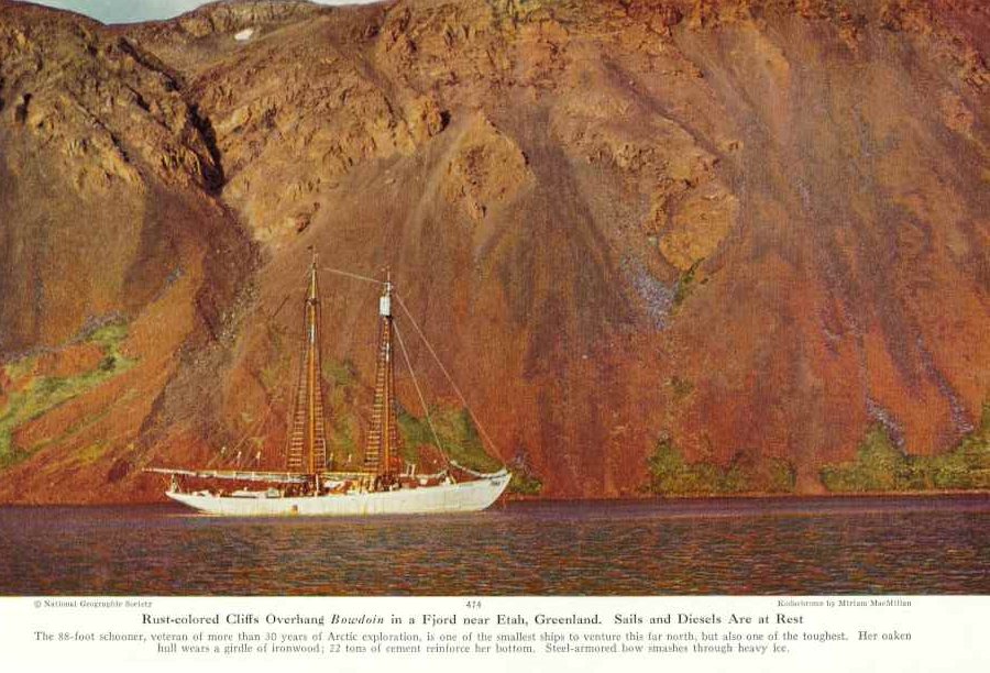 "Rust-colored Cliffs Overhang Bowdoin in a Fjord near Etah, Greenland. Sails and Diesels Are at Rest. The 88-foot schooner, veteran of more than 30 years of Arctic exploration, is one of the smallest ships to venture this far north, but also one of the toughest. Her oaken hull wears a girdle of ironwood; 22 tons of cement reinforce her bottom. Steel-armored bow smashes through heavy ice."