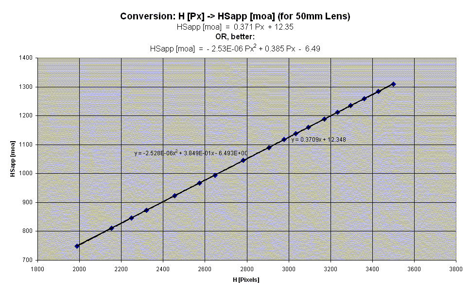 Greg Rudzinski wrote- "It is my understanding that the modern digital 50mm SLR camera produces an image equivalent to a 75 or 80mm film version." He added- "Also the diagonal is probably not a good way to measure with sensors arrayed in a rectangular grid.". Well, assuming radial symmetry of the distortion about the frame centre, the measurement could be made just as well across a central axis, lengthways or heightways, as across a diagonal. My intention in checking on the diagonal was to explore distortion over the whole area, right into the corners, where the distortions are likely to be greatest. and- "No clamping of the camera is needed with shutter speeds over 1/500 of a second. At these shutter speeds camera shake is not a factor and will allow use on a small craft. Sun limbs are surprisingly sharp even with a hand held telephoto. See attached 200mm example." That Sun disc in Greg's attachment was very sharp, showing what a steady hand he has. But that wasn't the purpose of the clamping that I proposed. The intention was to fix the camera over the whole sequence of observations, just as in the Greenland example we've been looking at. Presumably Greg's picture was taken from on land. I suggest that observing from the unsteady footing of a small craft would be a very different matter, even at 1/500 sec. =========================== If we take a mid-value of 78 mm, between Greg's suggested equivalent of "75 or 80mm", that would subtend angles about the centre point of +/13.0º about the width of the frame, +/- 8.7º about the height, and +/- 15.5º to the corners. This is significantly narrower than the angular width of the Greenland photo we have been looking at, so the distortions will be considerably less. The "50mm" graph supplied by Marcel, and attached again here, showed altitudes amounting to nearly 22º, equally disposed about the centre, so that the horizon must be 11º below the centre and the Sun 11º above it, that must have been made with the camera in "portrait" mode. That's what Greg was referring to in "rotating the camera 90 degrees". Marcel provided calibration plots for both 50mm and 100mm lenses, but the one of real interest is that of 50mm, which is attached once again. Those graphs show remarkably careful observation, with very little scatter about the fitted line, and don't depart much from simple linearity. But depart they do, as shown by the computed line of fit not passing through the origin, but showing a small offset. Two alternative fitted equations are shown, one linear, one second-order, with little to choose between them, but it looks to me as though only one line-of-fit has been drawn, the second-order fit. I have used that graph to check out my suggested model, in which radius in the array varies as the tan of the subtended angle from the centre point. In this case, because each measurement has been equally disposed about that centre point (a sensible practice which minimises distortion) the relevant angle is half the altitude. So I have tried a function as follows- H(pixels) = 18140 Tan (altitude / 2) (in degrees) or, for those that prefer it the other way, Altitude in degrees = 2 arc-tan ( pixels / 18140) And I can report that that function fits exactly on top of the data and the fit-line that's already drawn in, so that it's just not possible to see any difference. And if, as is likely but unconfirmed, the array has been made with exactly the same spacing along the other axis, that will be the calibration curve on that direction also. And, indeed, along a radius in every other direction too, if such a radius is measured in pixel-equivalents using Pythagoras.. The constant of 18140, which depends on the pixel spacing (which we haven't been told) and the focal length, was arbitrarily chosen to get a fit. Of course, it's a poor test of the correctness of the tangent model, simply because it's restricted to such a small range of angles from the optic axis, so the resulting distortion is so low. All we can really say is that it doesn't discredit that model by showing any disagreement with observation. However, from that model, I can now confidently predict that at the maximum altitude shown. of 22º, the distortion will enhance the observed diameter of the Sun, in the vertical direction, by 3%, over what it would have been if seen on the optic axis. And enhance its width by 1%. So if Sun diameter is being used as a yardstick for calibration, that would have to be taken into account. George. contact George Huxtable, at george@hux.me.uk or at +44 1865 820222 (from UK, 01865 820222) or at 1 Sandy Lane, Southmoor, Abingdon, Oxon OX13 5HX, UK.
