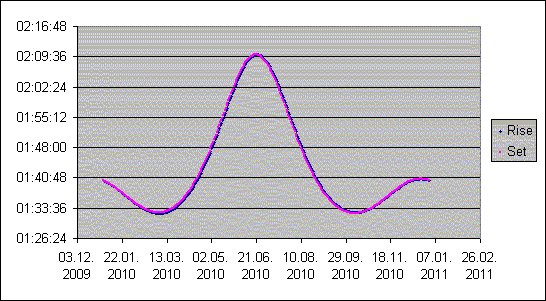 Well, it seems that this response to an apparently simple question from Joel Silverberg has become a somewhat inglorious eoisode in the history of Navlist. I started off the rot by writing solstices, when I meant to say equinoxes. Then Marcel seems to have made a double error, which happened to cancel out, and got the right answer for the wrong reasons. ======================= The story so far. The situation so far is that we seem to agree that there is a maximum in the length of twilight at each solstice, and a minimum near each equinox. But note that now I say near each equinox, not at each equinox, because my view has now changed significantly. Rather belatedly, I realise that the question of shortest twilight, that Joel posed, is not so trivial after all. I now think that all told, we (or at least, I) have been jumping to confusions. It's true that there's a maximum twilight length around each solstice, which is defined simply by symmetry. (Here, I'm neglecting effects caused by the eccenticity of the Earth's orbit, which perhaps shouldn't be neglected). But those maxima are very different in twilight length, between Summer and Winter solstice, as Marcel's graph shows. And that asymmetry, between Summer and Winter, affects the symmetry of the minimum, around the equinoxes, as is also shown in Marcel's plot. My initial response, that the matter was a trivial one, was based on my understanding that the rate-of-fall of the Sun as it crosses the horizon is greatest at the equinox: as indeed it is. But Joel's question was about the time taken for its altitude to fall from 0º to -18º, which is not symmetrical about the horizon line. If we had been asked about the time for the altitude to fall from +1º to -1º, or even from +18º to -18º, we could confidently say that those intervals would minimise at the equinox. Not so, however, between 0º and -18º If you look carefully at Marcel's plot, which I recopy here, you will see that the dates of the mimima are indeed shifted from the dates of the equinoxes. Which makes Joel's question a lot more entertaining. Our answers have fallen short. George. contact George Huxtable, at george@hux.me.uk or at +44 1865 820222 (from UK, 01865 820222) or at 1 Sandy Lane, Southmoor, Abingdon, Oxon OX13 5HX, UK.