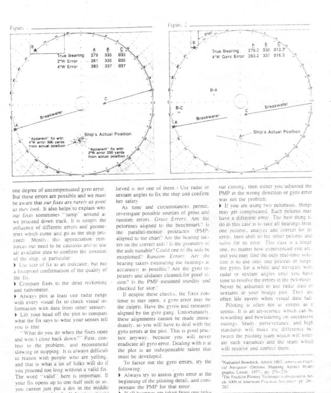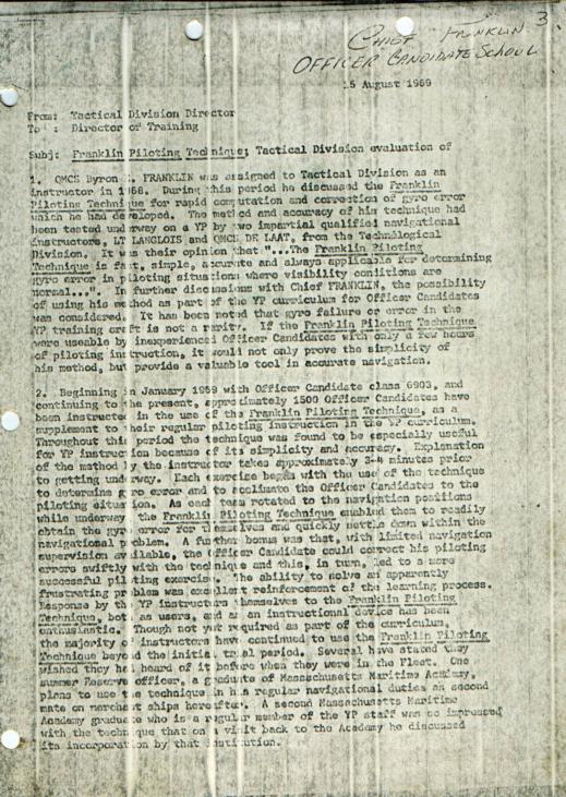 Compass Error Correction. To Joe and others, I looked on the Internet and did find) trial and error with my name on it? the only place I could find it was a school that taught many subjects. I looked in the quartermaster 1st and chief. MY technique was there but no mention of trial and error. I do have a navigation compendium and it mention trial and error not under my name. The important thing is the alongside the pier writing I sent to NAVLIST is not a trial and error, it is a definite way of to monitor the compass movement, getting a true bearing and while tied up can check the compass with a single observation of the known bearing to the Navaid. The Franklin Piloting Technique is for underway or any time. I have used it at over 15 knots, but you must have good bearing shooters. As for the Compendium I remember a Navy writer coming into OCS 1965 I believe. I was introduced to him along with many other chiefs teaching navigation at that time. He was not a teacher, but a writer. This writer was there to pick brains of the chiefs to write this Compendium. So where my name was attached to trial and error I do not know, (It is not attached in the Compendium) and certainly would not want my name attached to trial and error. Trial and error is useless, a very slow process and would not be used normally on Navy ships. You really don't have time to guess. Looking back at some of my old papers I find, trial and error listed with my technique, not with my name, at Annapolis Maryland and other places. Maybe a good sea story will explain how my technique came about in the Navy. I had developed the Franklin Plotting technique on an old liberty Hull with very bad Gyro; I alone knew and used this technique. Years later, I was transferred from a Polaris submarine to OCS (1964). OCS Newport, they had YP’S boats for underway training. The YP’S did have bad Gyro's. A friend of mine a senior chief quartermaster was complaining that he hated to show three-point fixes on the blackboard in class, and then go to sea with his students and plotting large triangles with confusion as a result. I took 15 minutes to teach the senior chief quartermaster how to use this technique, making drawings on a piece of paper. The senior chief went to sea on the YP’S the next week, after a week at sea in Newport Narragansett Bay. He came back to the classroom, he told me of him, just sitting on the chart desk, after explaining to the OCS my technique, and said they handled the Gyro beautifully getting good fixes instead of large triangles. He pushed me into to send a letter to Oceanographic Office Washington DC. I did not mention I was in the Navy. Mr. Brown of the oceanographic office received the letter and evaluated as the best thing that he had ever evaluated. He found out who I was and where I was, OCS, by questioning the Department of Navy personnel. He named it the Franklin piloting technique and wrote an article on its use. The Franklin piloting technique was not authorized in the OCS curriculum. By this time, it was legally taught on the YP’S at Annapolis Maryland., and was also taught at OCS under the table. The Capt. OCS got word of FPT. Being taught at Annapolis and a member of his staff was the one who developed it. He did not know that it was taught under the covers at his command on the YP’S. Since it was not on the curriculum at OCS ’l was told they could not use it, but the YP’S continue it use? (It solved problem of the bad gyro.) Earlier I was called in to the Capt. and asked why Annapolis was using my technique and I told the captain that paperwork on my technique was on his commander’s desk for about a year. .After another evaluation at his command the captain offered me money for a Benny suggestion or a metal. I was transferred to the aircraft carrier Intrepid after she ran aground I ended up getting the money from OCS and later getting the medal from the Intrepid. There's much more to the sea story but it could go on forever. Our first day above the Intrepid we got on the way and I discovered they had 1.5 E error without touching the chart all I did was see the triangles that was plotinged. With a little chart work and practice you may look at you text or training course and master the problem of compass error.