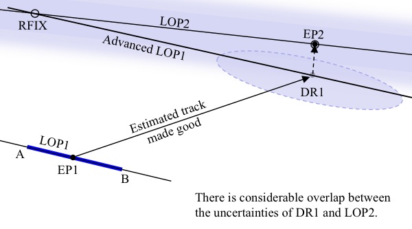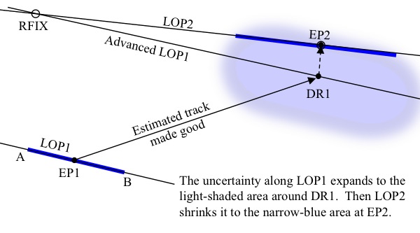 The first attachment below shows the dead reckoning propagation of uncertainty from EP1 to DR1 under the conditions for the EPRF. Without any further information, the best position estimate is at EP2 because the product of the probability along LOP2 (dark blue) with the probability distribution (light blue) centered on DR1 is maximum there. In the short-run case the dark-blue uncertainties would extend all along both the advanced LOP1 and along LOP2, putting the fix at RFIX, just as you said.