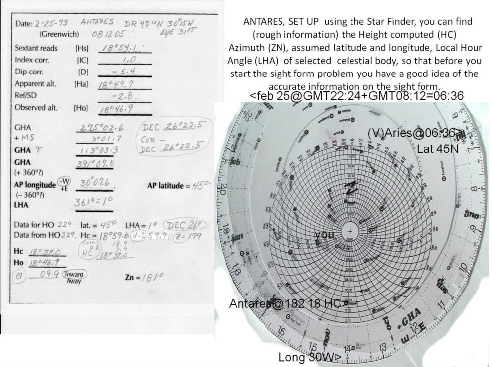 One of the reasons that I join the Journal of navigation, and later Navlist, among other navigation forums, was to try and keep navigation, especially celestial Navigation alive. Navlist is important to me because I think that Navlist is striving to teach, talk, write about and help keep celestial navigation alive, (it seems to be a losing battle.)I realize that they are many ways to easily get bearings and altitude of stars, but these are the black boxes that the answer comes from; the answer is quick and just there. There is no thought it just comes with no insight or knowledge, there is no way to understand if it is even correct, It is a great check on your work , but you are certainly not the master; the equipment is, right or wrong. I recently started a class with only a few interested, I think because of the time 1 PM in the afternoon. I have been able to get a few people interested in my Celestial training aid “STAR FINDER “for celestial navigation, but this also is few in number. I am still under the opinion that my training aid, two minute star finder, can help bridge gap between, who cares! and a real interest in the star finding and celestial navigation. As I have said before I have a PowerPoint presentation about the many things my two minutes star finder can perform, which I would like to introduce various sections of this presentation to try to spark interest in others and what can be done using this star find, unlike the 2102-D star finder. This presentation is how to setup the two minutes star finder prior to working on the sight form. Since the star finder is quick and easy to set up ,the person working the star finder and sight form (especially a NOVELIST) can easily see each step of the sight form, and catch any error while working the sight form. I believe by working the sight form and observing the setup on the two minutes star finder is a way to teach and create more interest while making everything easier to understand. BYRON