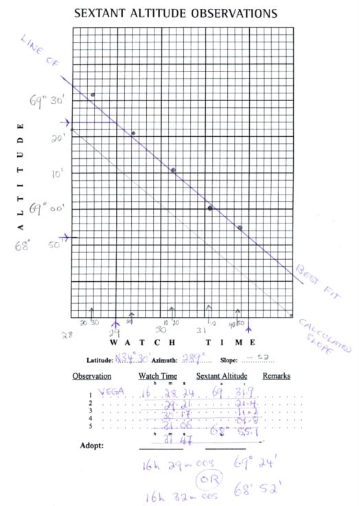 The linked file should show: the calculated line of slope, being the bottom line, the observations plotted according to altitude and time, and the 'line of best fit'; the top line which attempts to reconcile those sights. You can see that in this case I've given less weight to the first sight, although it is different by far too little to call it an outlier. Choosing the 'line of best fit' is a judgement call.