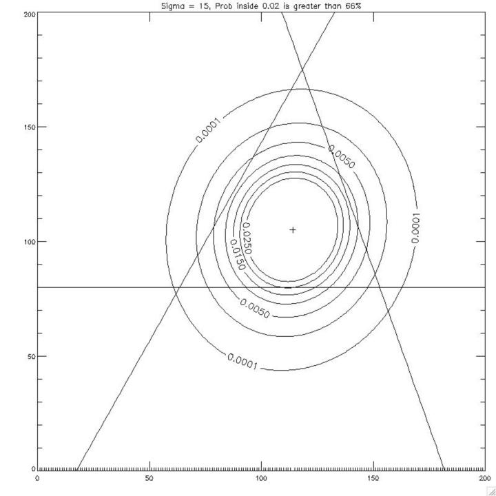 Attached are two examples of contour plots of fix probabilities per unit area P(x,y). One shows a case where the probability that the fix is inside the hat is less than 15%. The other shows a case where it's greater than 66%. These results are a numerical integration of P(x,y) inside the contour sited at the top of the plot. (Since these contours are appropriately over, or under, estimates of the hat area, the actual percentages are even more compelling than quoted here.)