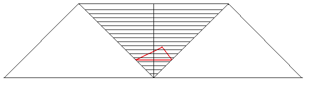Red is an example cocked hat. The device is overlaid on top of it so that left and right vertexes of hat's horizontal side lay on the diagonal lines (closely spaced parallel lines on a tool serve as guides to keep lower edge of a tool parallel to hat's side).